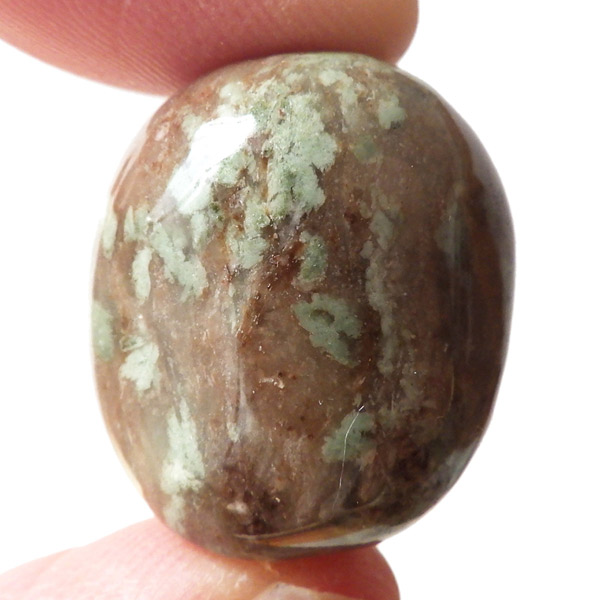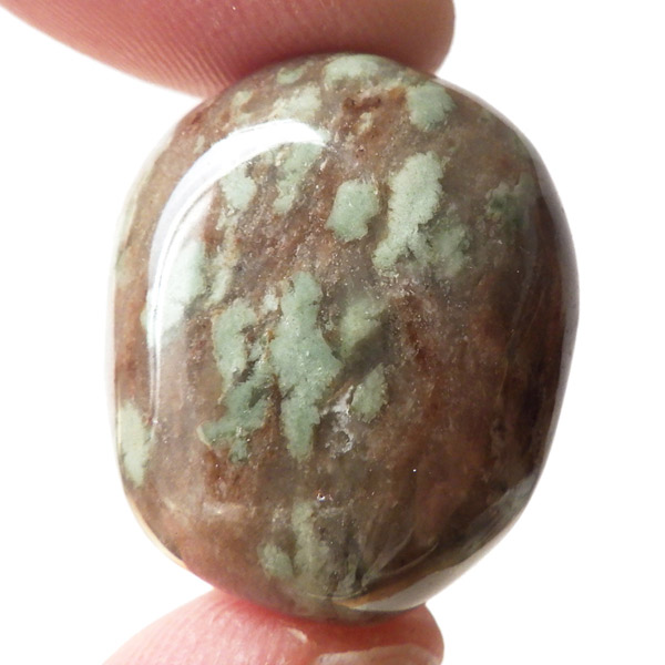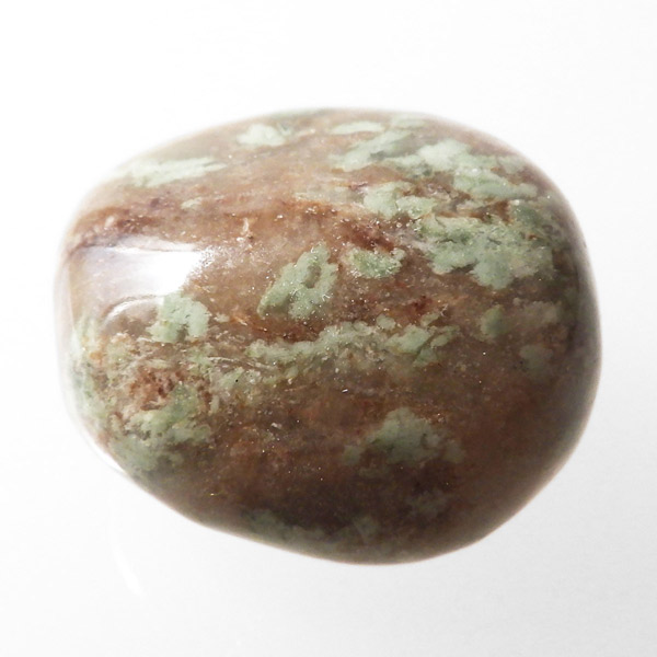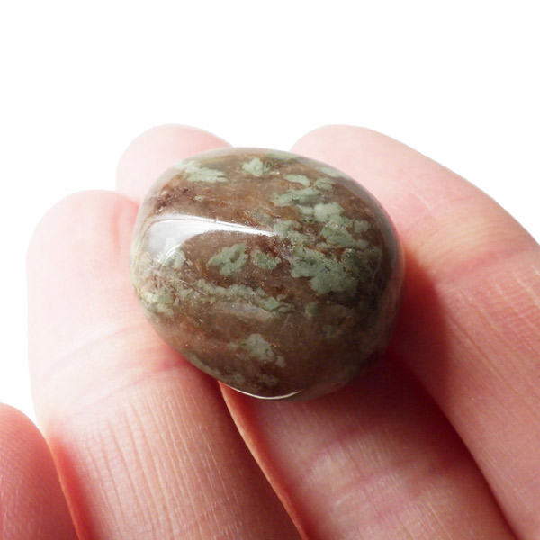 オーストラリア産のナンドライト、タンブルです。ナンドライトはオーストラリア・ニューサウスウェールズ州の小さな町ナンドルが産地である、希少であまり知られていない岩石です。ナンドライトという名前は、この産地に由来しています。ナンドライトの本質的な分類はエジリン閃長岩(エジリン・サイアナイト)にあたります。茶色やベージュ系のサイアナイト母岩の中に、深いグリーンのエジリンがドット状に散りばめられており、その独特な模様と色合いが非常に魅力的です。