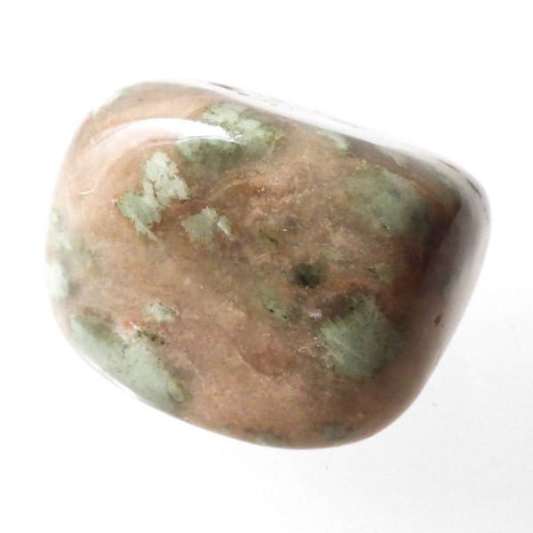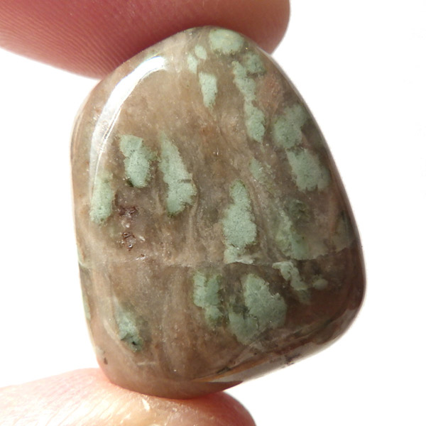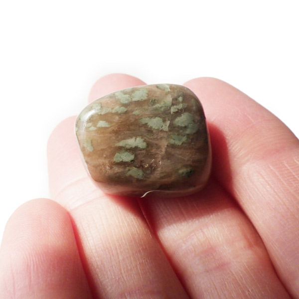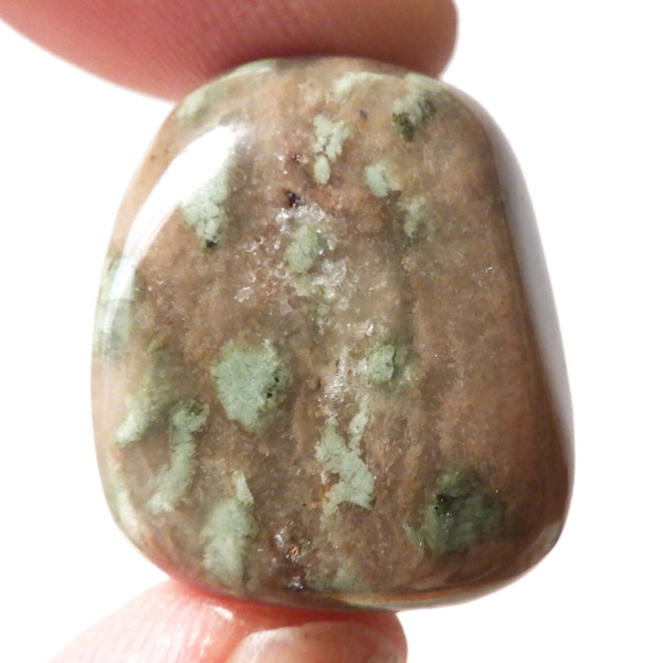 オーストラリア産のナンドライト、タンブルです。ナンドライトはオーストラリア・ニューサウスウェールズ州の小さな町ナンドルが産地である、希少であまり知られていない岩石です。ナンドライトという名前は、この産地に由来しています。ナンドライトの本質的な分類はエジリン閃長岩(エジリン・サイアナイト)にあたります。茶色やベージュ系のサイアナイト母岩の中に、深いグリーンのエジリンがドット状に散りばめられており、その独特な模様と色合いが非常に魅力的です。