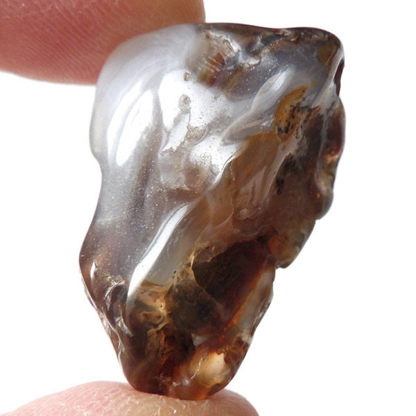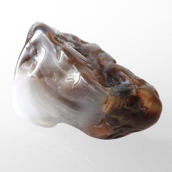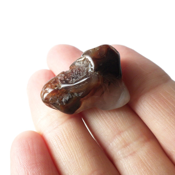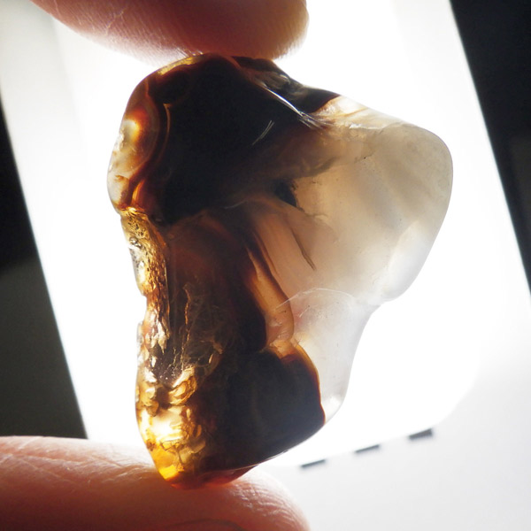 メキシコ産のファイヤーアゲート、タンブルです。ファイヤーアゲートはその名の通り、炎の揺らぎを思わせるオレンジのグラデーションが特徴的な石です。このオレンジはリモナイトによるものといわれております。光に透かすと透明部分とオレンジ部分のコントラストがとても美しいです。