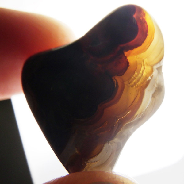 メキシコ産のファイヤーアゲート、タンブルです。ファイヤーアゲートはその名の通り、炎の揺らぎを思わせるオレンジのグラデーションが特徴的な石です。このオレンジはリモナイトによるものといわれております。光に透かすと透明部分とオレンジ部分のコントラストがとても美しいです。