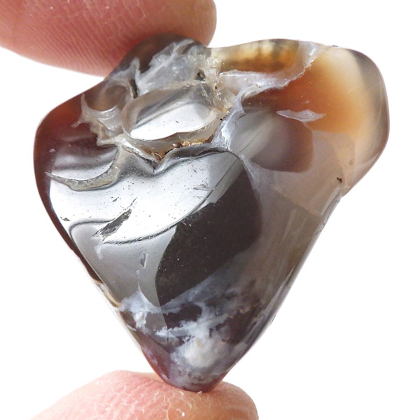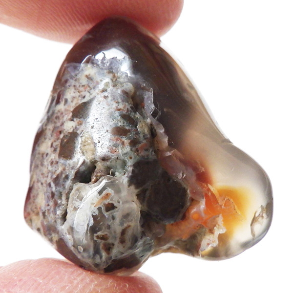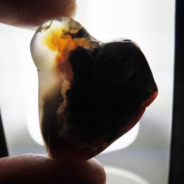 メキシコ産のファイヤーアゲート、タンブルです。ファイヤーアゲートはその名の通り、炎の揺らぎを思わせるオレンジのグラデーションが特徴的な石です。このオレンジはリモナイトによるものといわれております。光に透かすと透明部分とオレンジ部分のコントラストがとても美しいです。