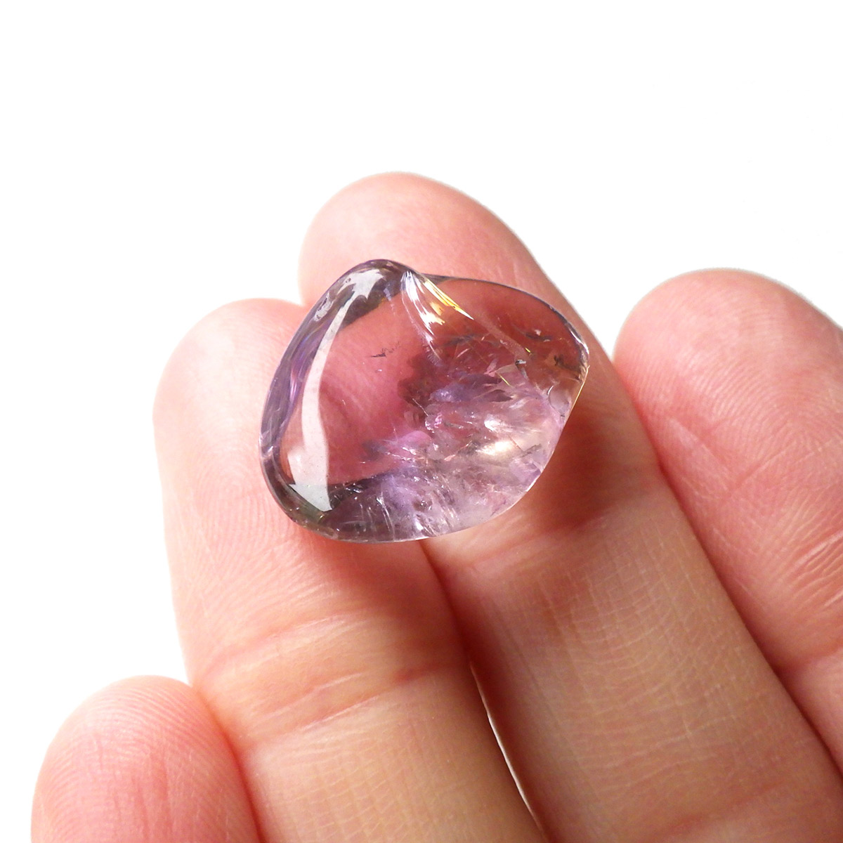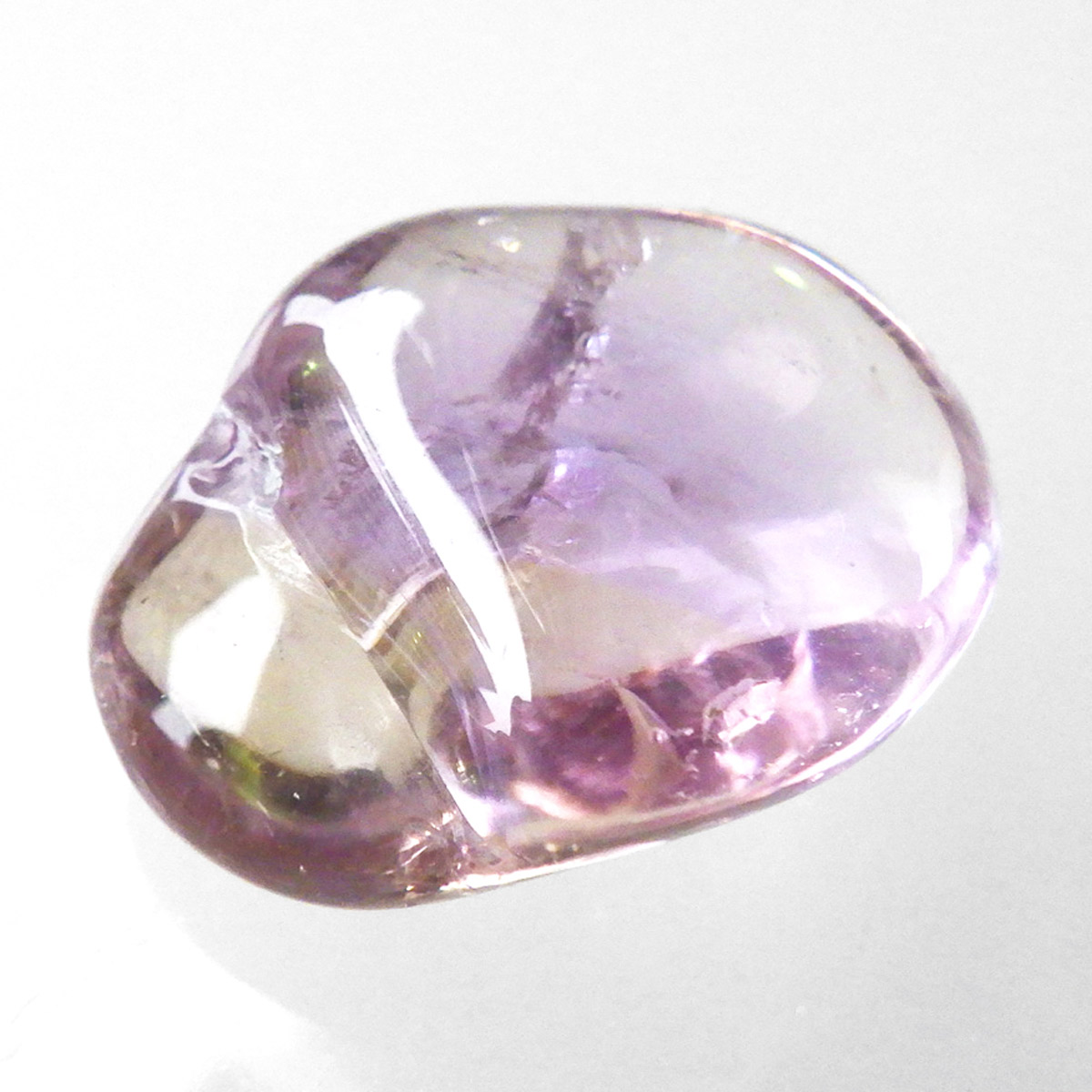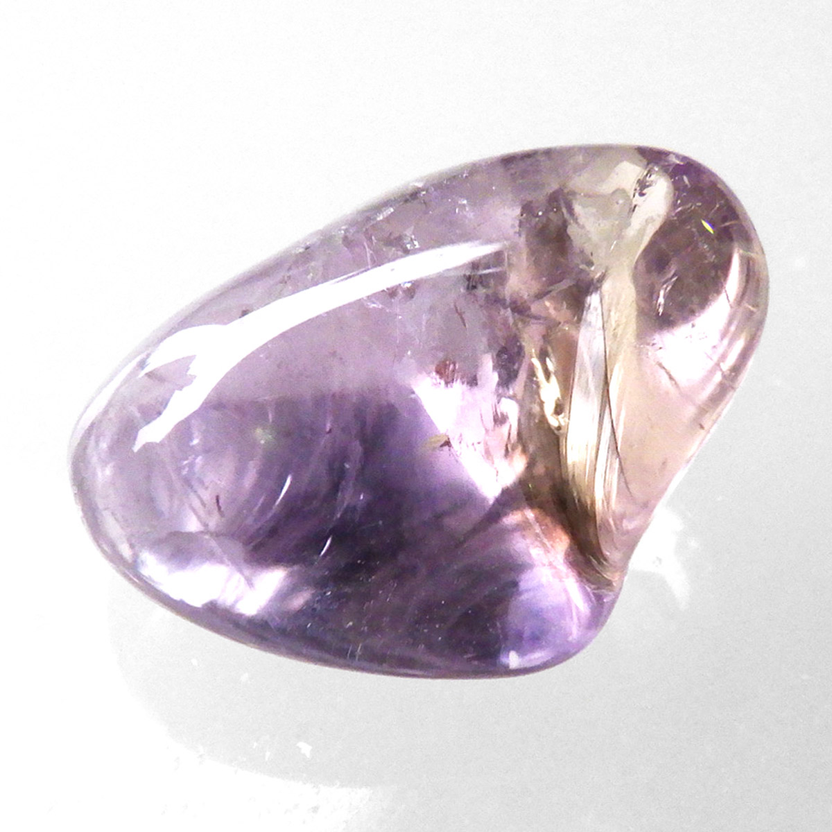 ボリビア産のアメトリン、タンブルです。アメトリンはアメジストとシトリンが混ざり合った石です。天然のアメトリンは極々限定された条件下でしか生成されません。透明度も抜群で、濃いアメジストとシトリンのカラーが大変美しいです。水晶の透明部分も見られ、透明~パープル~イエロー~へのグラデーションは、まさに息を飲むほど美しいです。また、アメトリンを照らす光の種類や、タンブルの角度によって、濃く見えたり薄く見えたり、青っぽく見えたり赤っぽく見えたり、見ていて飽きることがありません。アメジストとシトリンの二つの顔を併せ持った魅力的な水晶です。