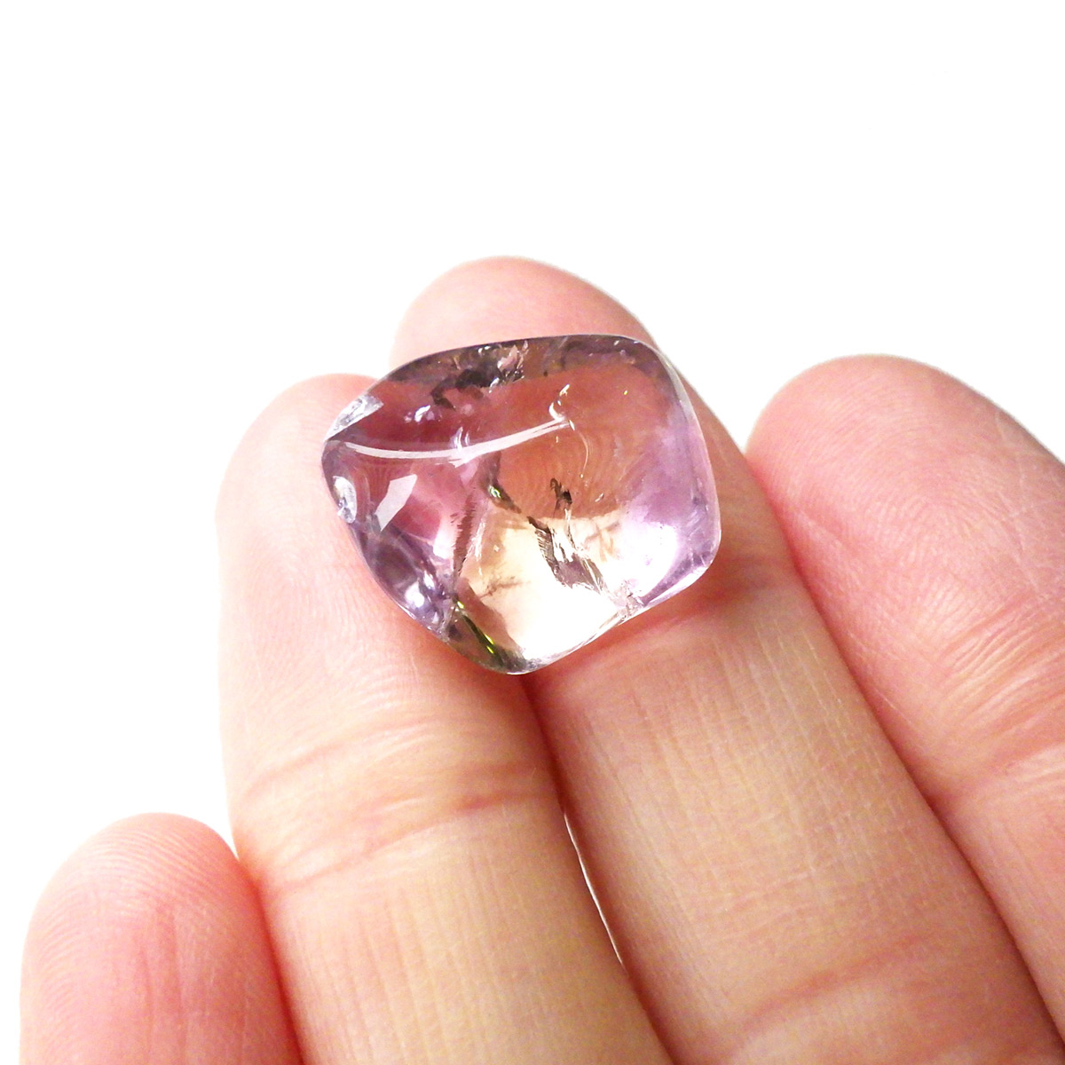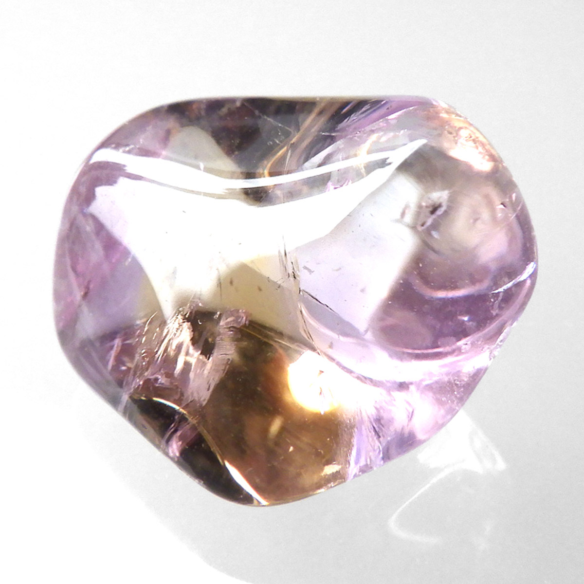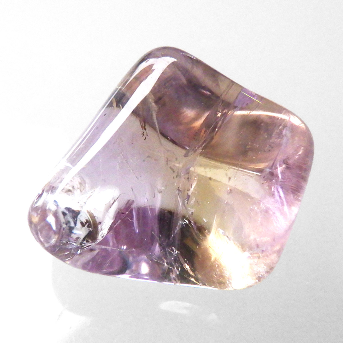ボリビア産のアメトリン、タンブルです。アメトリンはアメジストとシトリンが混ざり合った石です。天然のアメトリンは極々限定された条件下でしか生成されません。透明度も抜群で、濃いアメジストとシトリンのカラーが大変美しいです。水晶の透明部分も見られ、透明〜パープル〜イエロー〜へのグラデーションは、まさに息を飲むほど美しいです。また、アメトリンを照らす光の種類や、タンブルの角度によって、濃く見えたり薄く見えたり、青っぽく見えたり赤っぽく見えたり、見ていて飽きることがありません。アメジストとシトリンの二つの顔を併せ持った魅力的な水晶です。