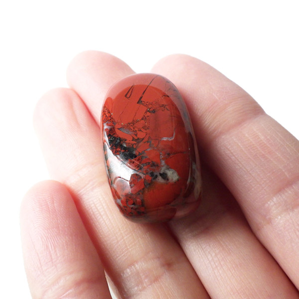 ブラジル産のポピージャスパー、タンブルです。 ジャスパーは、様々な不純物を含んだ石英の総称で、含まれる不純物によって、赤、緑、黄、黒、褐色など、多くの色や模様を持ちます。古くから「聖なる石」と崇められてきた鉱物で、太陽崇拝のインカ帝国では、レッドジャスパーが生命の源の石としてまつりに使用されていたそうです。このポピージャスパーは鮮やかで艶があり、石英によって独特の模様が楽しめます。
