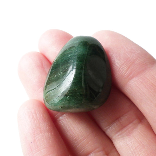 南アフリカ産のフックサイト、タンブルです。フックサイト、発音によりフクサイト、またはクロムマイカと呼ばれております。マイカ(雲母)グループの中のモスコバイト(白雲母)の変種で緑色になったものがフックサイトです。和名はクロム白雲母でクロムにより緑色に発色しております。写真では分かりずらいですが、雲母の粒子で表面はキラキラとしております。