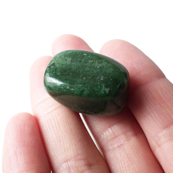 南アフリカ産のフックサイト、タンブルです。フックサイト、発音によりフクサイト、またはクロムマイカと呼ばれております。マイカ(雲母)グループの中のモスコバイト(白雲母)の変種で緑色になったものがフックサイトです。和名はクロム白雲母でクロムにより緑色に発色しております。写真では分かりずらいですが、雲母の粒子で表面はキラキラとしております。