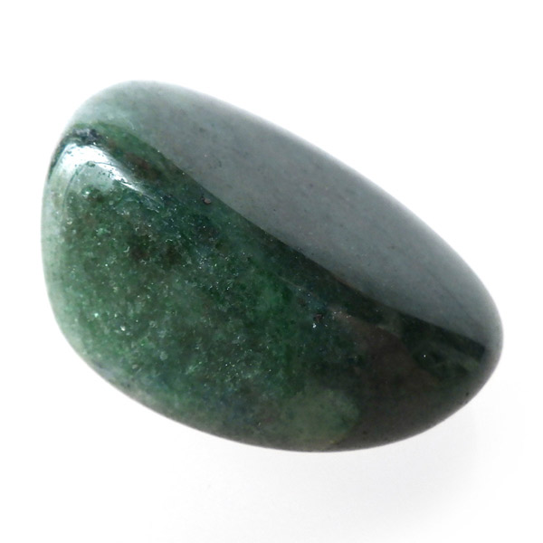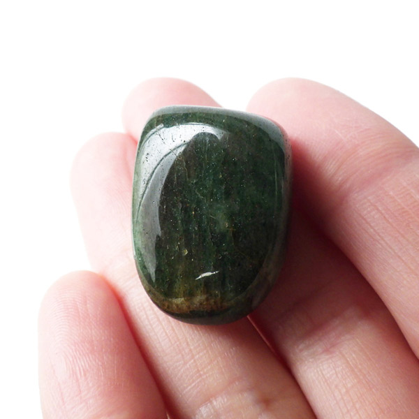 南アフリカ産のフックサイト、タンブルです。フックサイト、発音によりフクサイト、またはクロムマイカと呼ばれております。マイカ(雲母)グループの中のモスコバイト(白雲母)の変種で緑色になったものがフックサイトです。和名はクロム白雲母でクロムにより緑色に発色しております。写真では分かりずらいですが、雲母の粒子で表面はキラキラとしております。