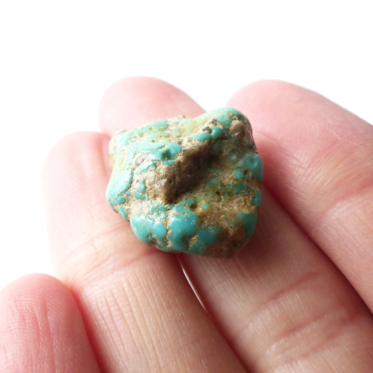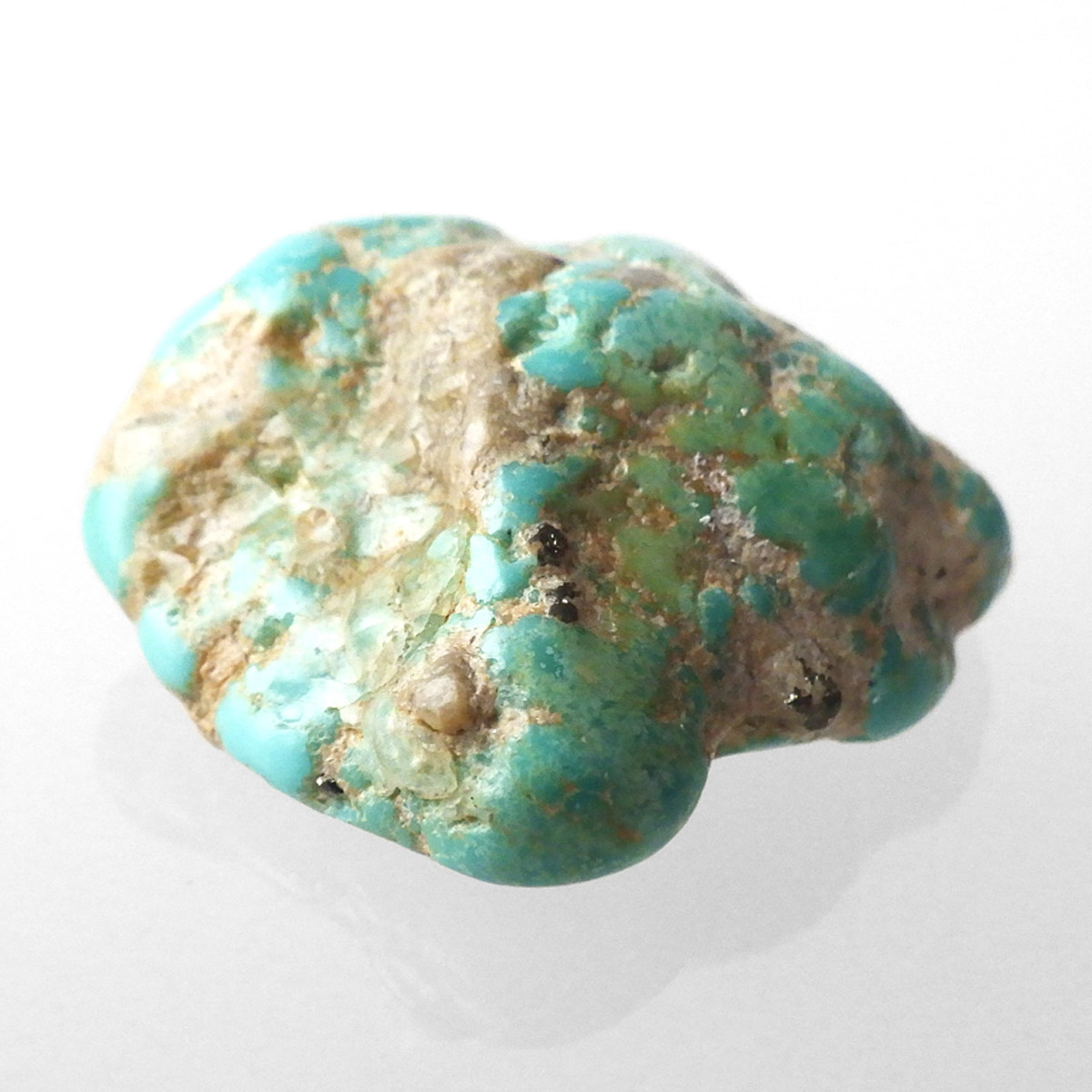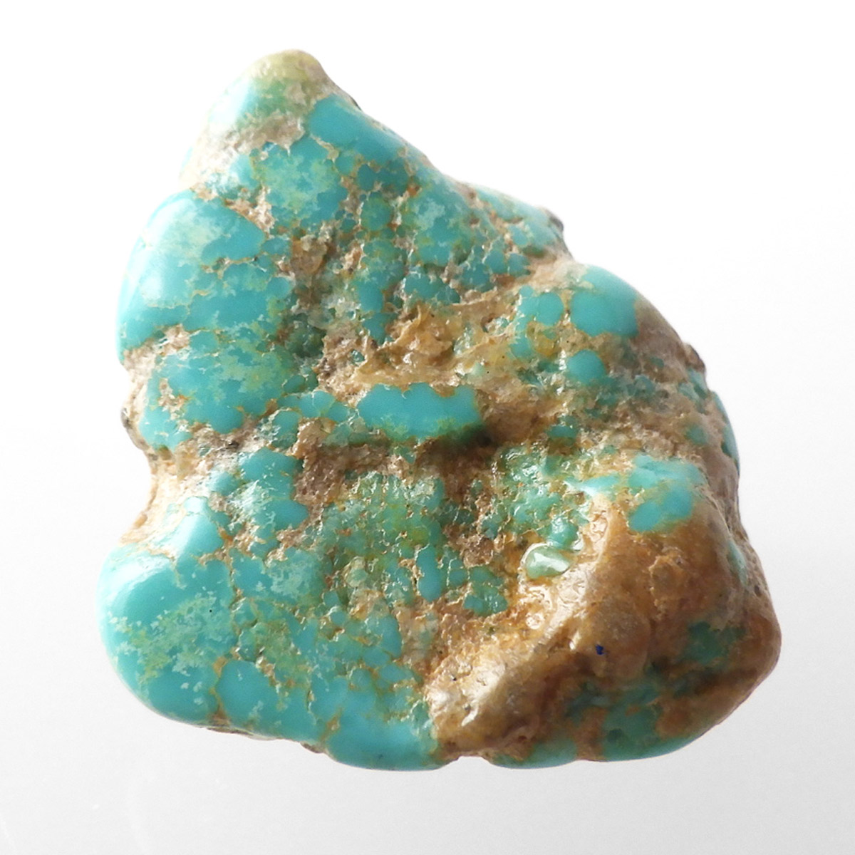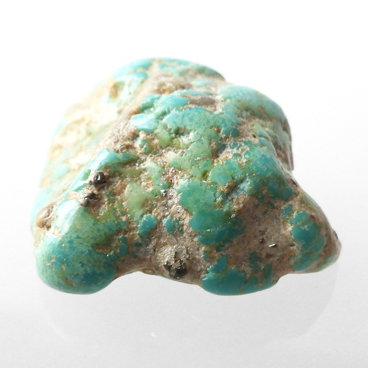 アメリカ・アリゾナ州産のキングマンターコイズ、タンブルです。キングマンターコイズはアリゾナ州キングマンでとれるターコイズのことです。ターコイズならではのブルーグリーンのカラーで全体に均一な色彩。パイライトが僅かに見られたり、ゴツゴツっとした原石の面影も残っていたり、母岩とのコントラスト模様も表情があり、おもしろいタンブルです。