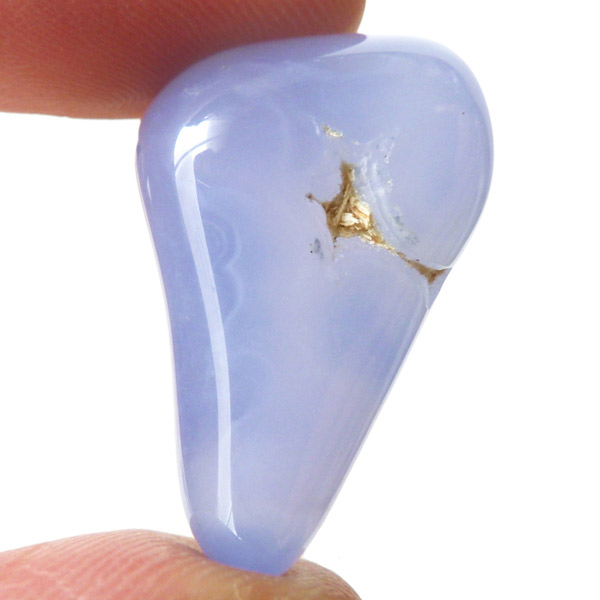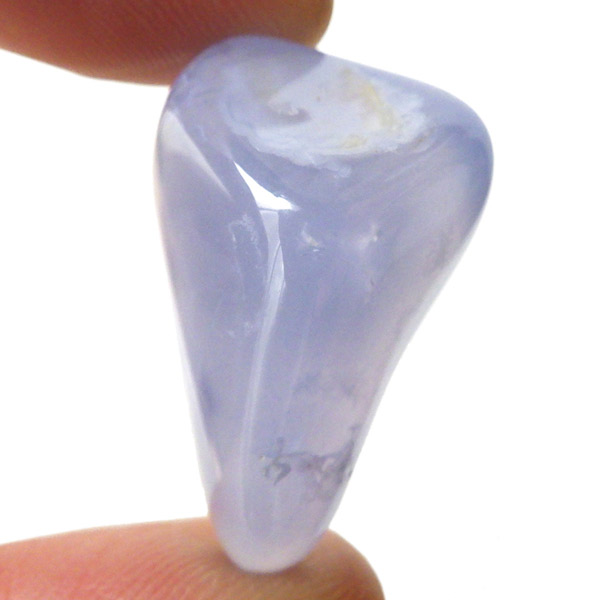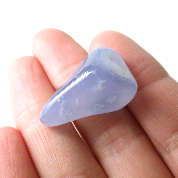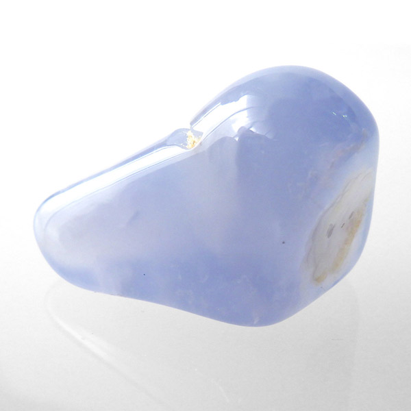 南アフリカ産のブルーカルセドニー、タンブルです。カルセドニーはアゲートとよく似ており、いろいろな色が混ざっており、模様があるものがアゲート、色が均一で模様がないものがカルセドニー分類されています。カルセドニーのグループにはカーネリアンやクリソプレーズなど鮮やかな石があるのは有名です。こちらのブルーカルセドニーは落ち着いたブルーの天然の発色で、光に当てるとミルキーな透け感があります。発色が良く、高品質なブルーカルセドニーのタンブルです。