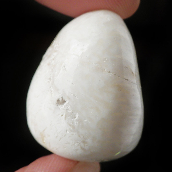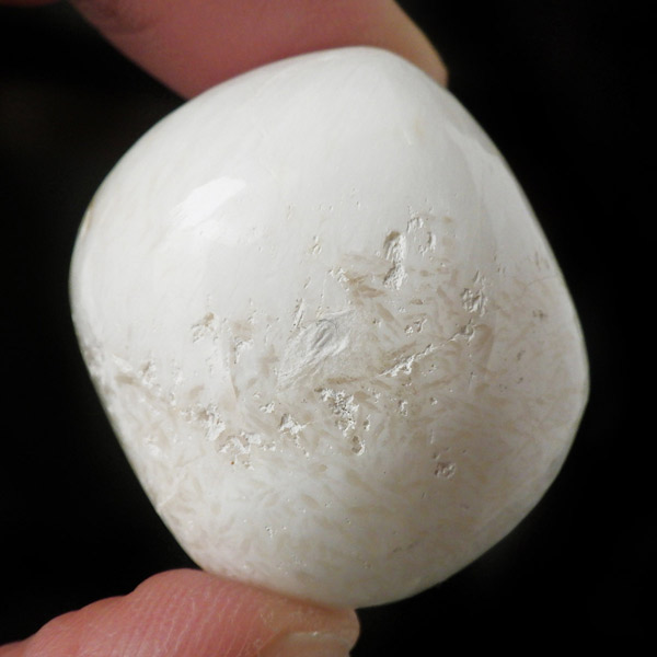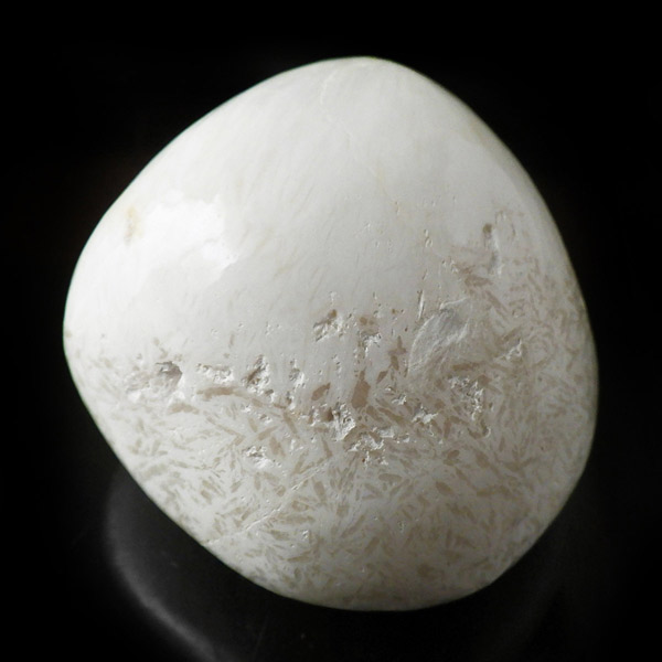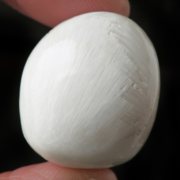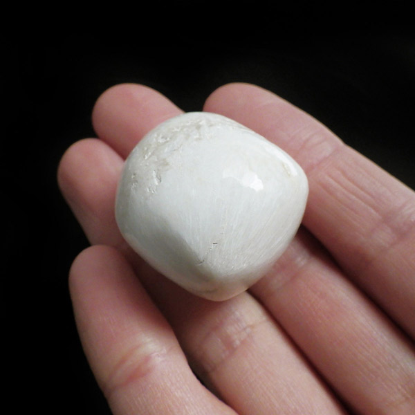インド産のスコレサイトのタンブルです。天使の羽みたいな繊維状の白色光沢が美しく、清らかなエネルギーを感じられる石です。直感力などを高めたり、過去の記憶を呼び起こして現在へと導く石と言われており、瞑想などにも適したヒーリングストーンです。ヒーラーに人気の石です。天然石の中でもかなり貴重なレアストーンです。