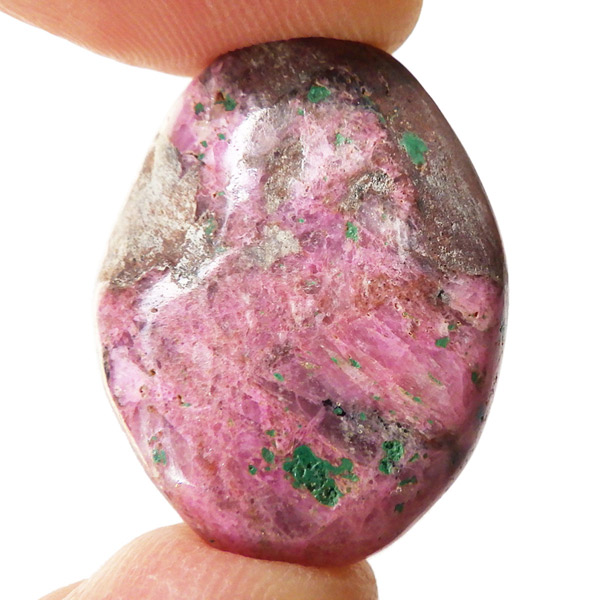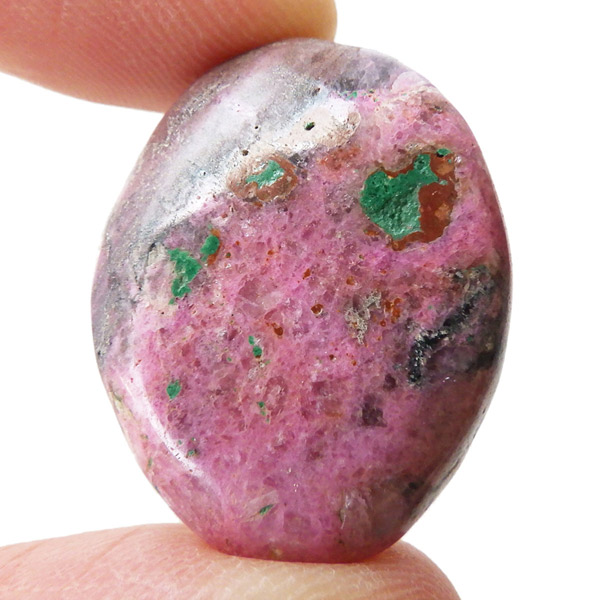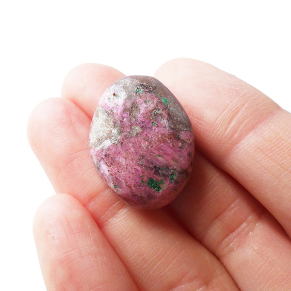 コンゴ産のコバルトカルサイト、タンブルです。コバルトカルサイトと言えば、モロッコが世界的に有名な産地ですが、コンゴ産と言えば比較的 新しい産地で ここ近年注目が高まっている新産地です。 コンゴ産の特徴はコバルト特有なビビットなピンクで、細やかな結晶はキラキラと美しく輝き、母岩を覆い尽くすように結晶しています。更に、コバルト系の鉱物にも関わらず、マラカイト・クリソコラ・パイライト・スクテルド鉱など様々な鉱物が混入するユニークなものです。これはモロッコ産にはまったく見られない特徴で、コンゴ産ならではのものといってよいでしょう。