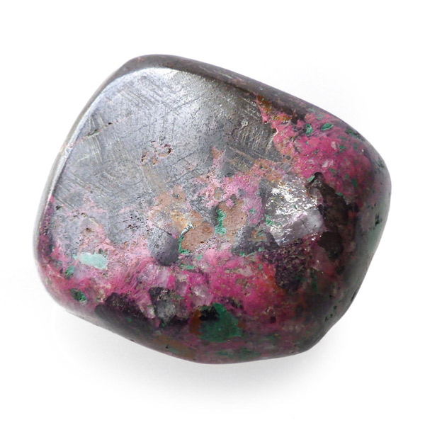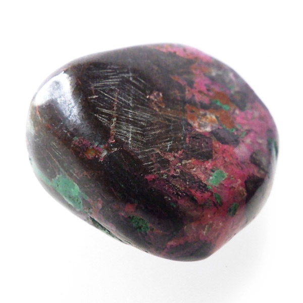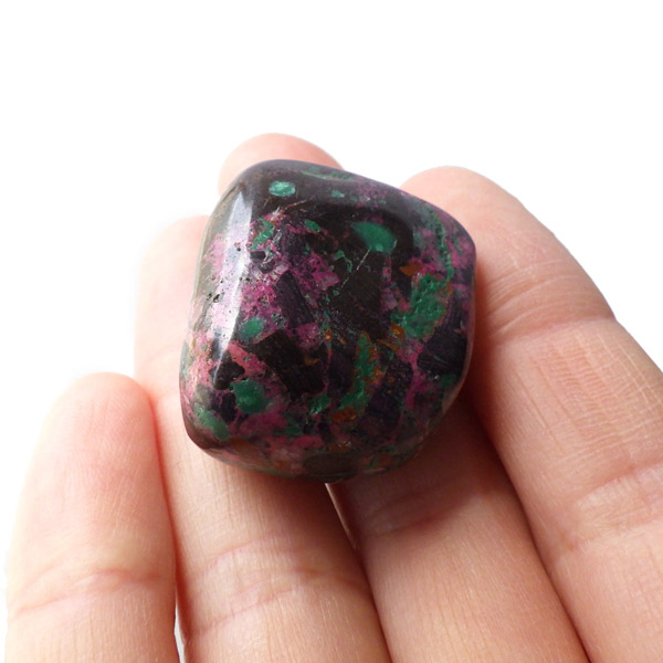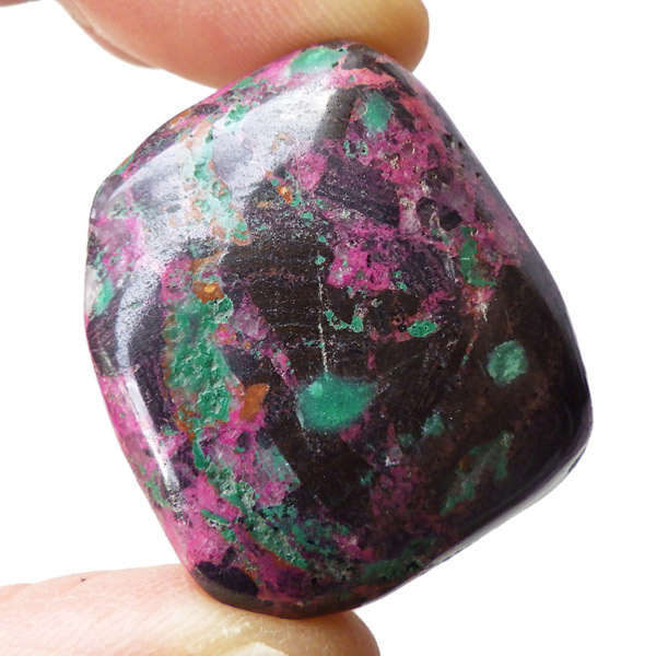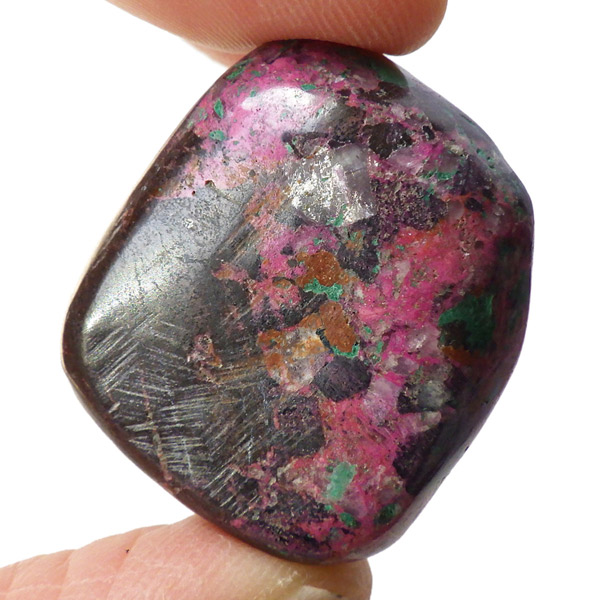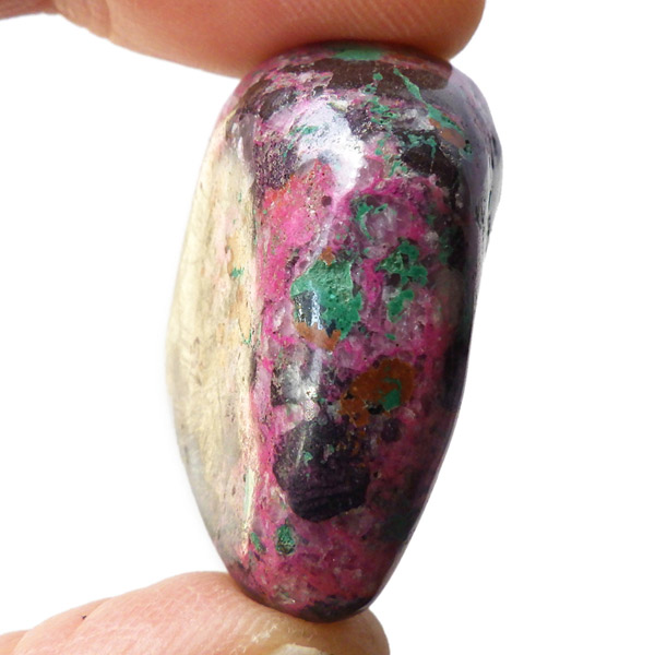 コンゴ産のコバルトカルサイト、タンブルです。コバルトカルサイトと言えば、モロッコが世界的に有名な産地ですが、コンゴ産と言えば比較的 新しい産地で ここ近年注目が高まっている新産地です。 コンゴ産の特徴はコバルト特有なビビットなピンクで、細やかな結晶はキラキラと美しく輝き、母岩を覆い尽くすように結晶しています。更に、コバルト系の鉱物にも関わらず、マラカイト・クリソコラ・パイライト・スクテルド鉱など様々な鉱物が混入するユニークなものです。これはモロッコ産にはまったく見られない特徴で、コンゴ産ならではのものといってよいでしょう。