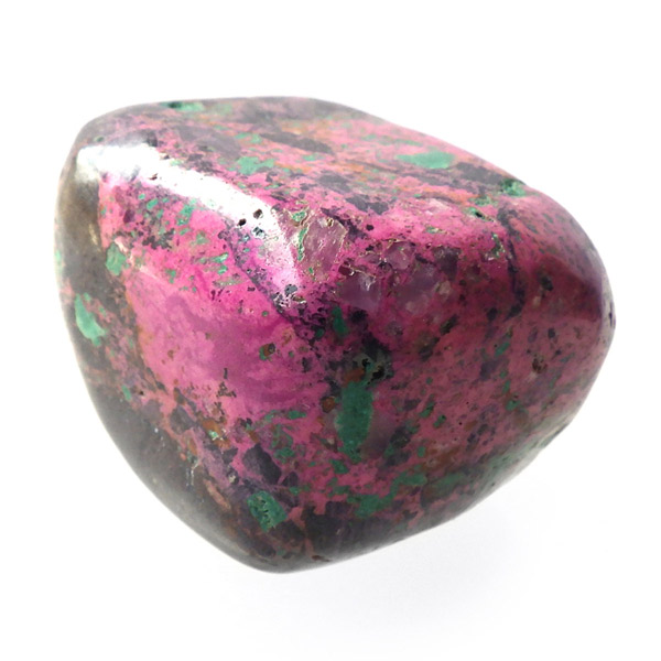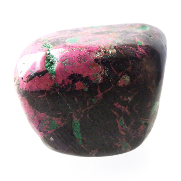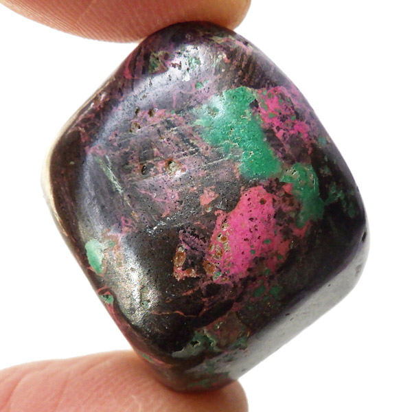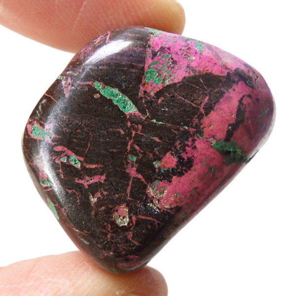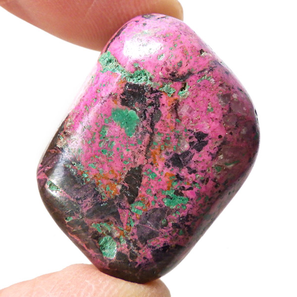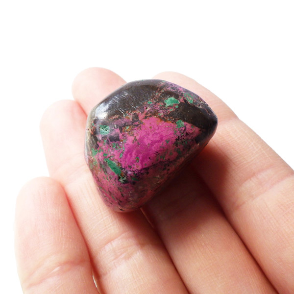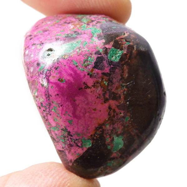コンゴ産のコバルトカルサイト、タンブルです。コバルトカルサイトと言えば、モロッコが世界的に有名な産地ですが、コンゴ産と言えば比較的 新しい産地で ここ近年注目が高まっている新産地です。 コンゴ産の特徴はコバルト特有なビビットなピンクで、細やかな結晶はキラキラと美しく輝き、母岩を覆い尽くすように結晶しています。更に、コバルト系の鉱物にも関わらず、マラカイト・クリソコラ・パイライト・スクテルド鉱など様々な鉱物が混入するユニークなものです。これはモロッコ産にはまったく見られない特徴で、コンゴ産ならではのものといってよいでしょう。