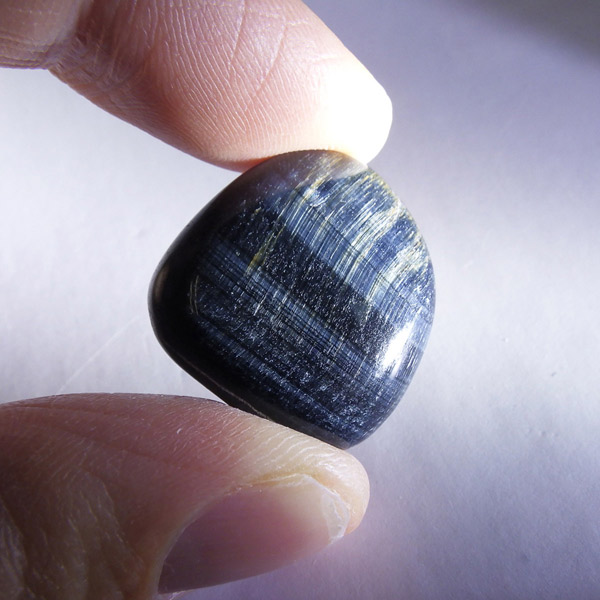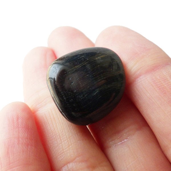ブラジル産のウルフアイ、タンブルです。ウルフアイまたはウルフズアイとして表記されています。ウルフアイは流通名でホークスアイからタイガーアイに変化している間の両石の一面が同時に見られる石のことを呼んでいます。おおまかにホークスアイに分類されている場合もあるかと思います。色味でいえば青から黄色に変化する途中のものをウルフアイと呼びます。きれいに目が出ている特別なものを厳選してご紹介しております。ライトなどで照らすと、よりキラリとキャッツアイ効果が分かりやすく輝くかと思います。ウルフアイの名前の通り、かっこよく光り輝く素敵な石です。