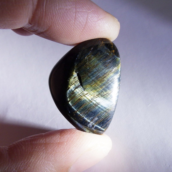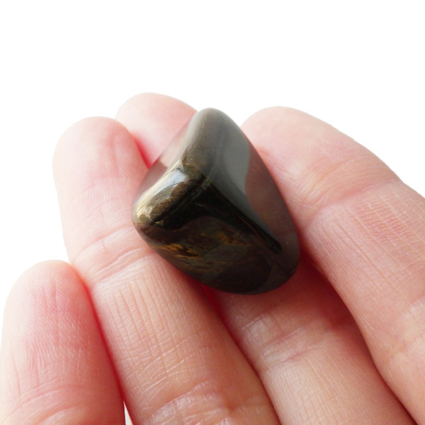 ブラジル産のウルフアイ、タンブルです。ウルフアイまたはウルフズアイとして表記されています。ウルフアイは流通名でホークスアイからタイガーアイに変化している間の両石の一面が同時に見られる石のことを呼んでいます。おおまかにホークスアイに分類されている場合もあるかと思います。色味でいえば青から黄色に変化する途中のものをウルフアイと呼びます。きれいに目が出ている特別なものを厳選してご紹介しております。ライトなどで照らすと、よりキラリとキャッツアイ効果が分かりやすく輝くかと思います。ウルフアイの名前の通り、かっこよく光り輝く素敵な石です。