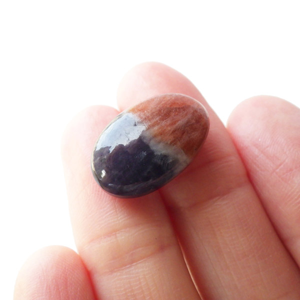 インド産アイオライトサンストーンのタンブルです。ネイビーのアイオライトとオレンジのサンストーン、この二つが混ざり合う大変レアな石です。更に、アイオライトとサンストーンがここまでハッキリ分かれているものは、見た目にもきれいで魅力的です。