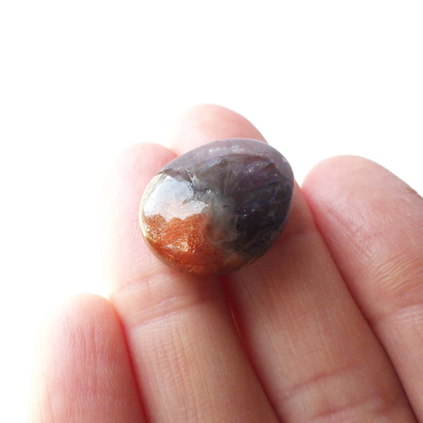 インド産アイオライトサンストーンのタンブルです。ネイビーのアイオライトとオレンジのサンストーン、この二つが混ざり合う大変レアな石です。更に、アイオライトとサンストーンがここまでハッキリ分かれているものは、見た目にもきれいで魅力的です。