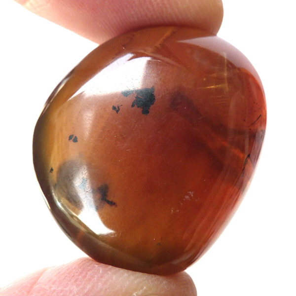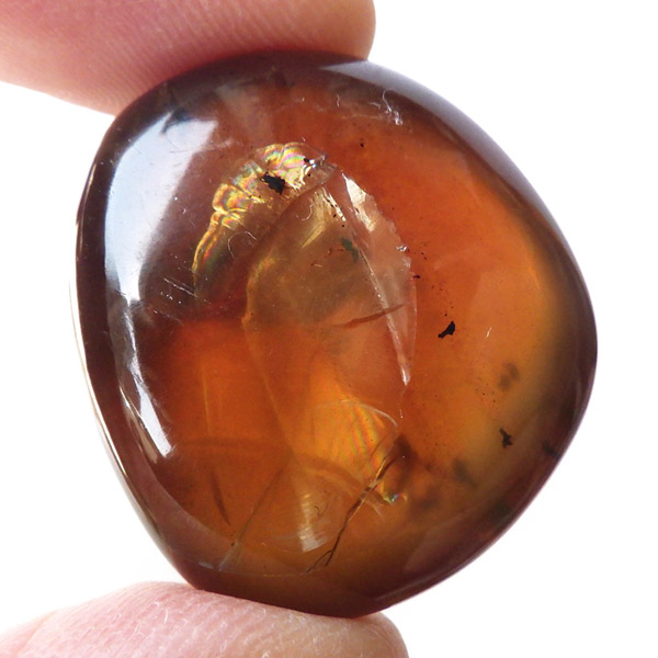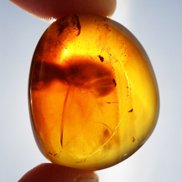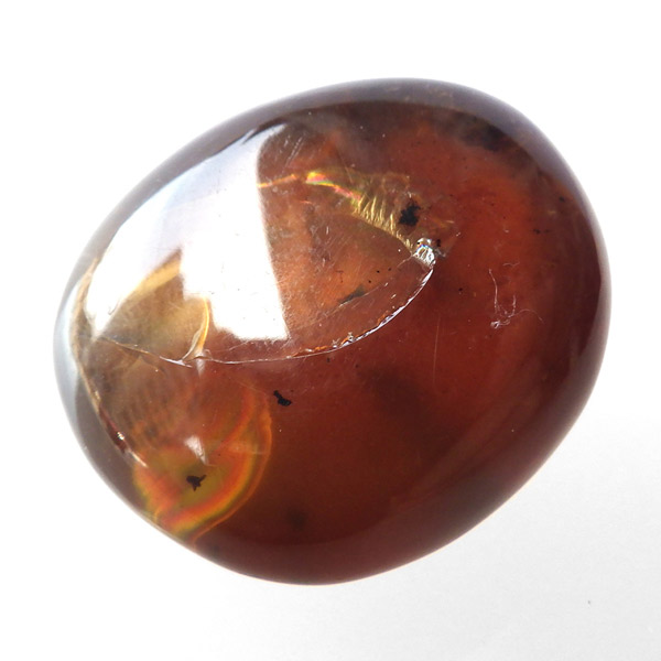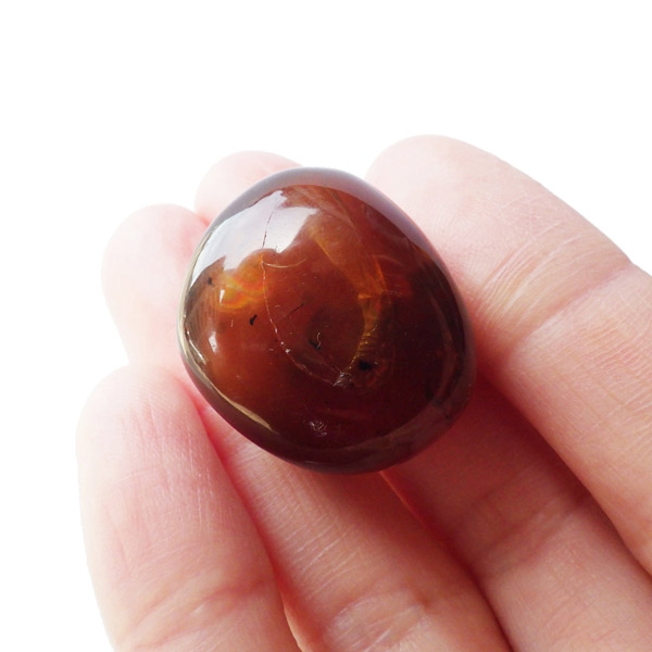 インドネシア産のアンバー(琥珀)、タンブルです。 松柏類の樹脂が3000万年以上の時を経て化石化したものです。 アンバーという名前は、古代アラビア語の「アンバール(海に漂うもの)」が由来です。インドネシアのスマトラで採取されるアンバーは石炭層の中から採れるのが特徴で、落ち着いた色合いのものが多いです。ブランデーのような深い色合いのアンバー内に斑点に似た濃い色の部分が見られます。スマトラアンバーは白熱光の下では赤みがかった色合いを示し、ブラックライトなどを使い、紫外線の下では青い蛍光を示す光学的特徴も持っています。色が綺麗なことはもちろん光を通しても綺麗で美しいです。