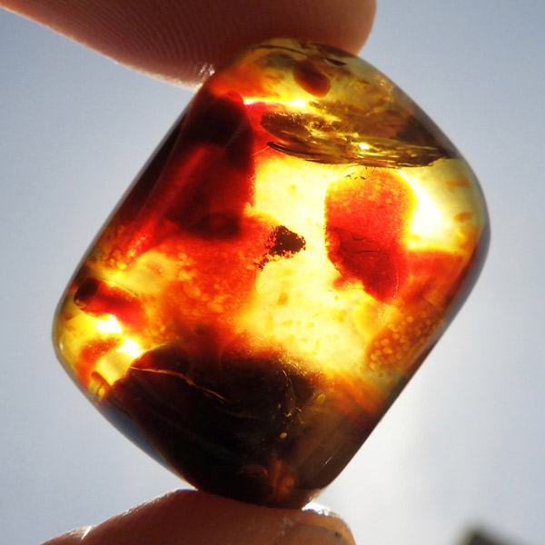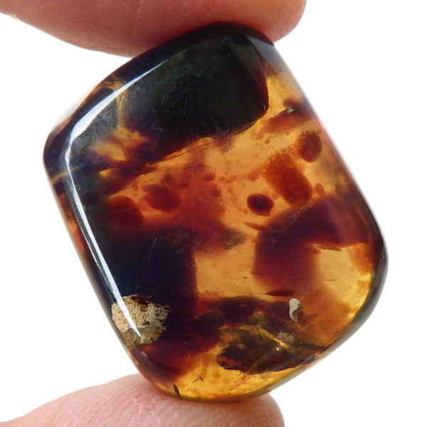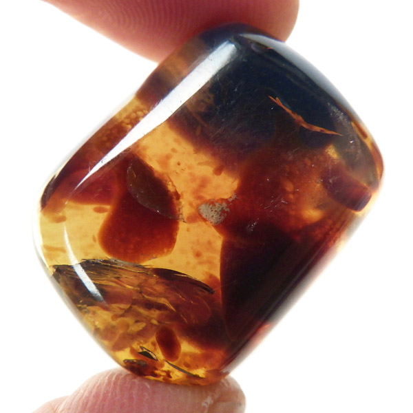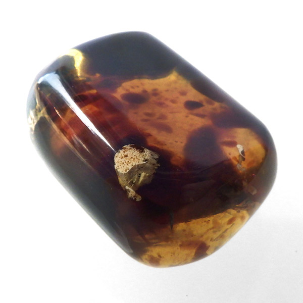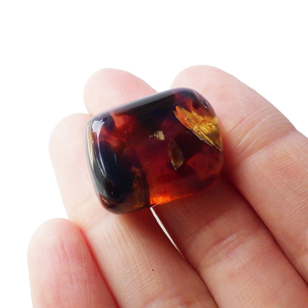 インドネシア産のアンバー(琥珀)、タンブルです。 松柏類の樹脂が3000万年以上の時を経て化石化したものです。 アンバーという名前は、古代アラビア語の「アンバール(海に漂うもの)」が由来です。インドネシアのスマトラで採取されるアンバーは石炭層の中から採れるのが特徴で、落ち着いた色合いのものが多いです。ブランデーのような深い色合いのアンバー内に斑点に似た濃い色の部分が見られます。スマトラアンバーは白熱光の下では赤みがかった色合いを示し、ブラックライトなどを使い、紫外線の下では青い蛍光を示す光学的特徴も持っています。色が綺麗なことはもちろん光を通しても綺麗で美しいです。