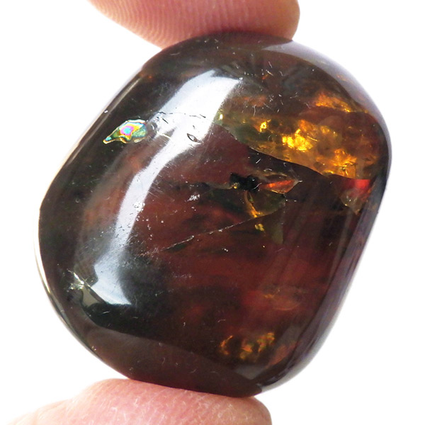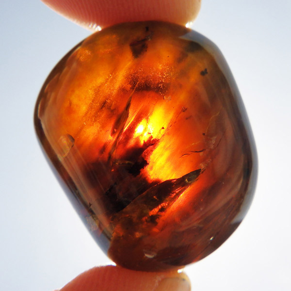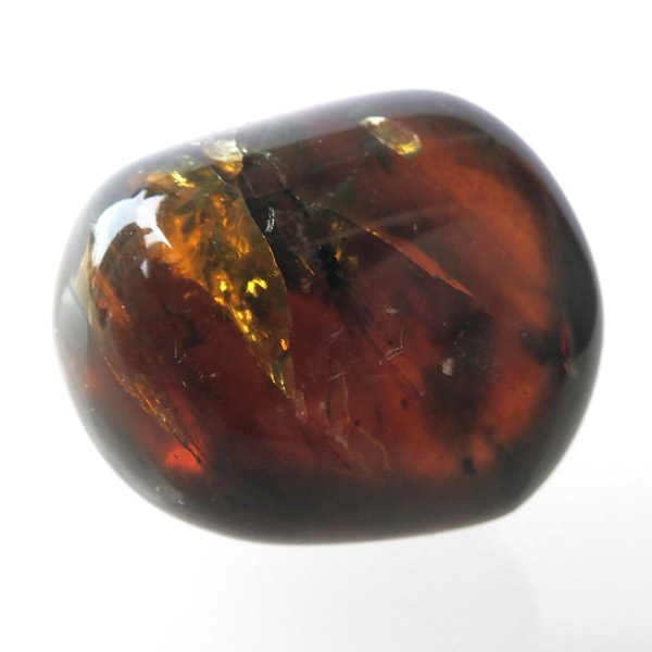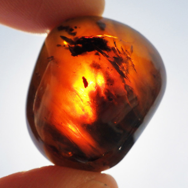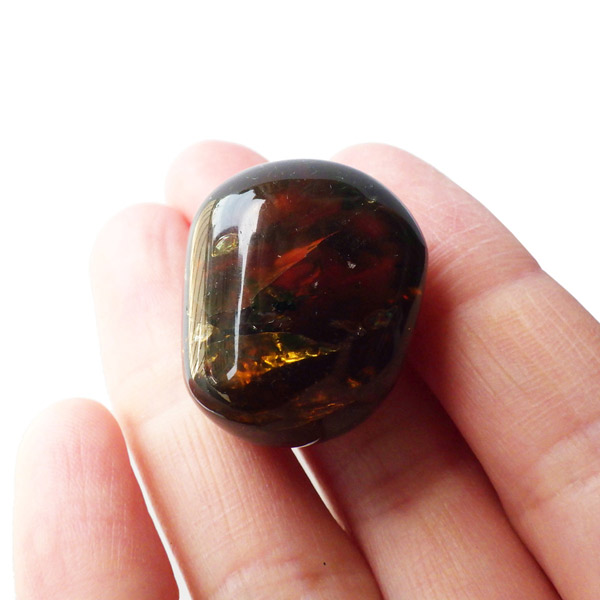 インドネシア産のアンバー(琥珀)、タンブルです。 松柏類の樹脂が3000万年以上の時を経て化石化したものです。 アンバーという名前は、古代アラビア語の「アンバール(海に漂うもの)」が由来です。インドネシアのスマトラで採取されるアンバーは石炭層の中から採れるのが特徴で、落ち着いた色合いのものが多いです。ブランデーのような深い色合いのアンバー内に斑点に似た濃い色の部分が見られます。スマトラアンバーは白熱光の下では赤みがかった色合いを示し、ブラックライトなどを使い、紫外線の下では青い蛍光を示す光学的特徴も持っています。色が綺麗なことはもちろん光を通しても綺麗で美しいです。
