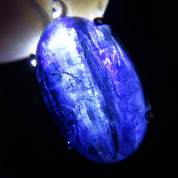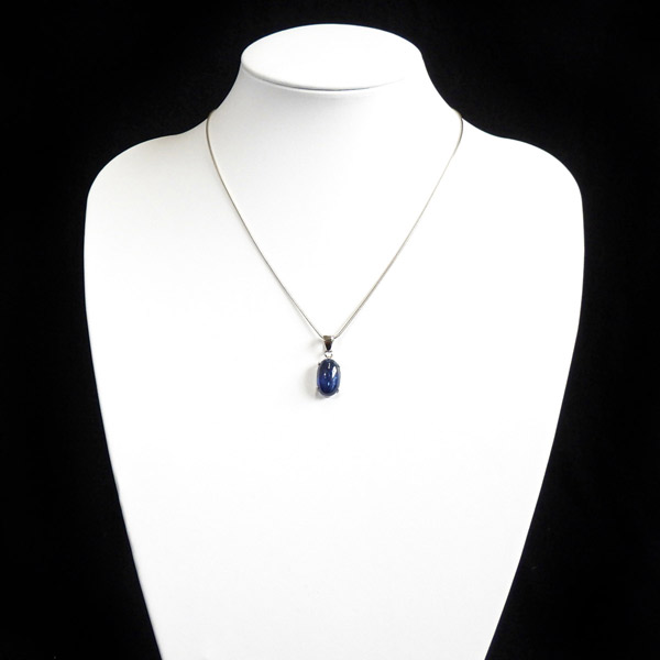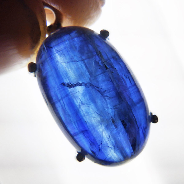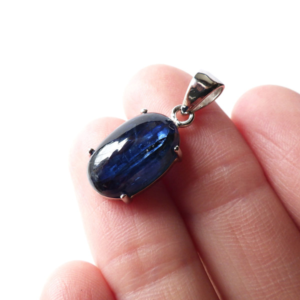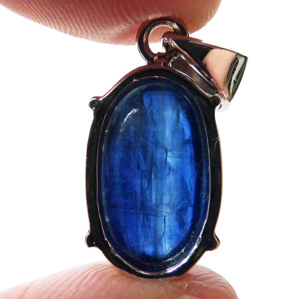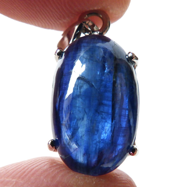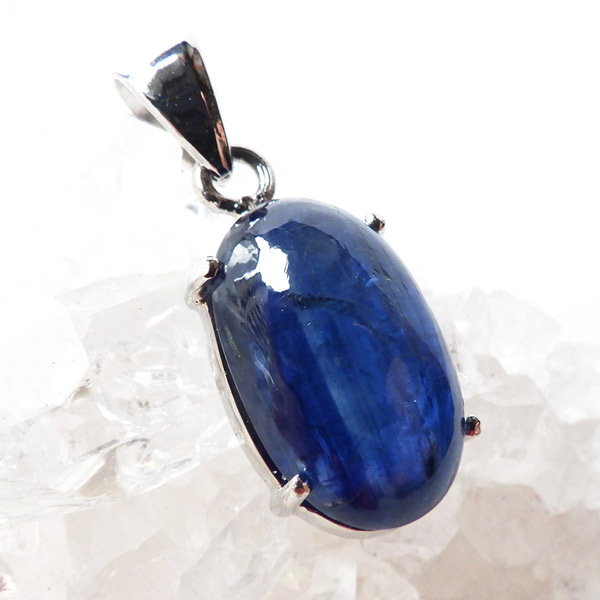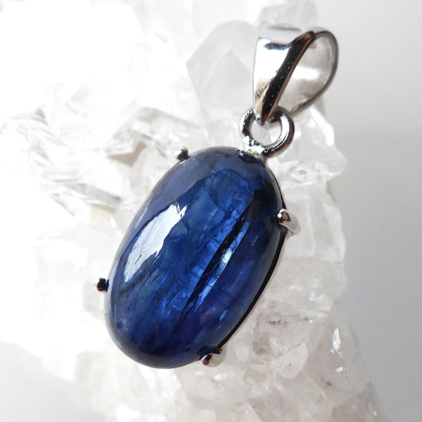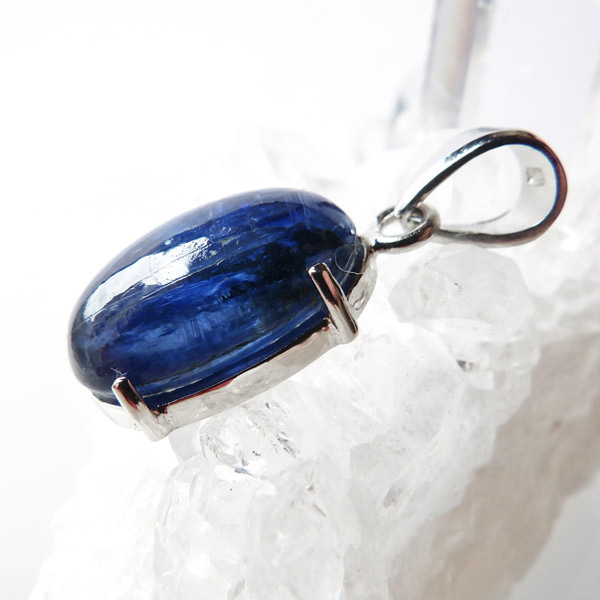 ヒマラヤ山脈の足元にあるネパールのタプリジュン産のカイヤナイトのペンダントトップです。カイヤナイトの独特のブルーは、サファイアと同じく、含まれる鉄とチタンが要因となっています。外見だけではブルーサファイアと見間違うこともあります。見た目にも一つの方向に繊維がはっきりと伸びているのが分かります。大変美しく濃い色のブルーと、抜群の透明度でクオリティの高い一点です。