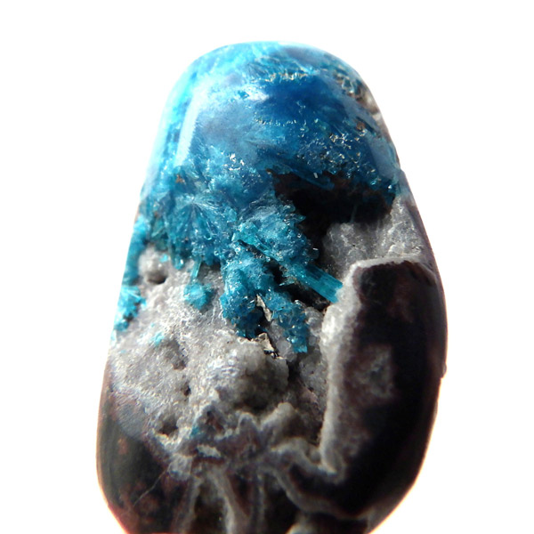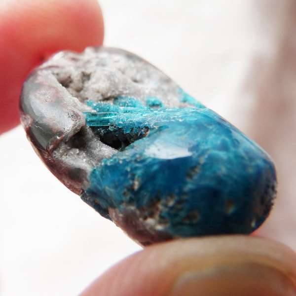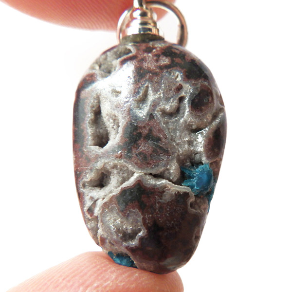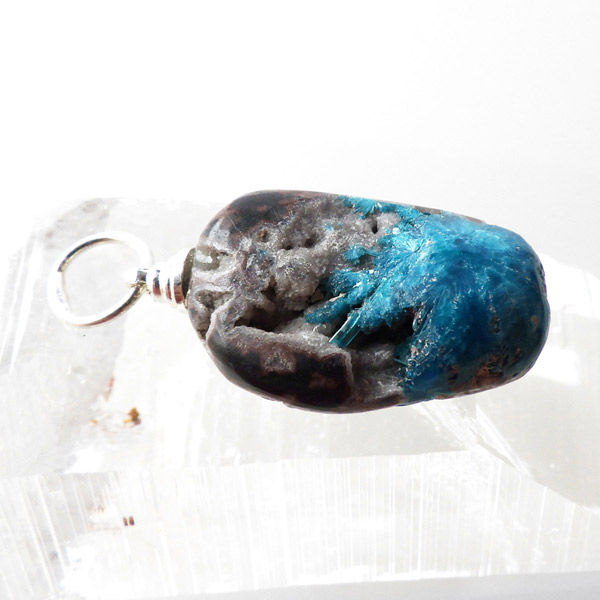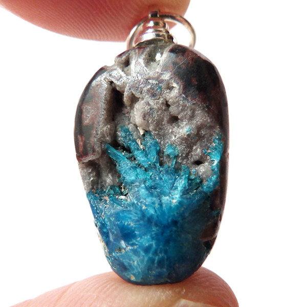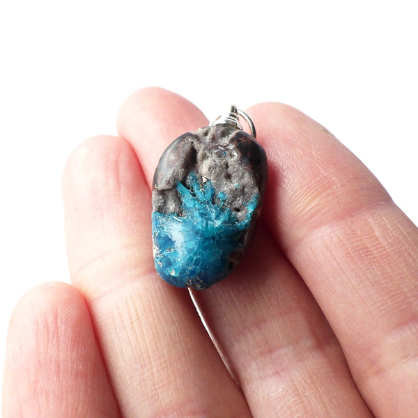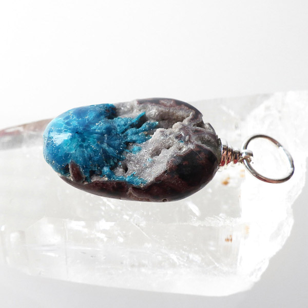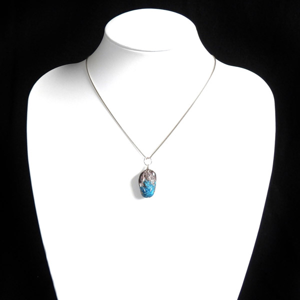 インド産のカバンサイトを使用したペンダントトップです。きれいなブルーの部分がカバンサイトで、そのほかの部分は母岩になります。ブルーとはいえ少しグリーンがかっていて、色の名前を調べたところ浅葱色(あさぎいろ)というのが近いでしょうか。