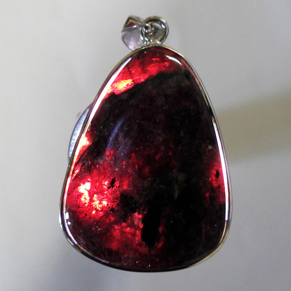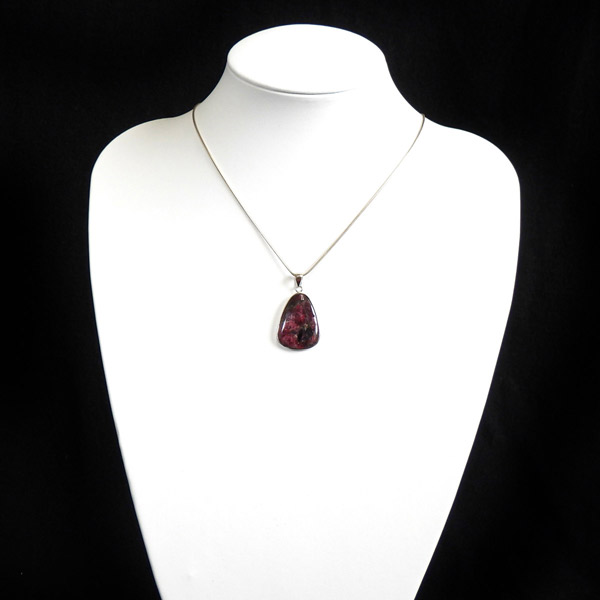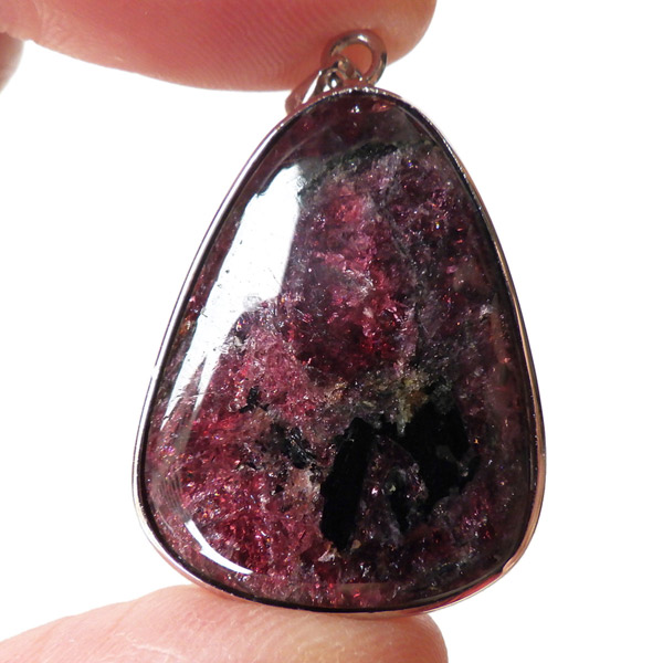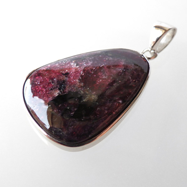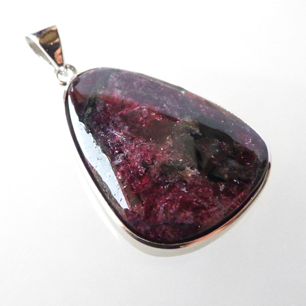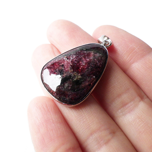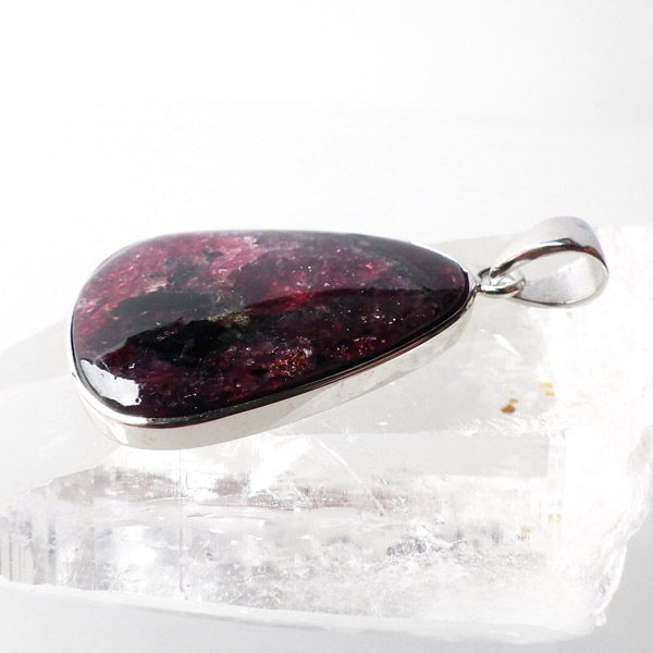 ロシア産、ユーディアライトのペンダントトップです。産出量の少ない希少な石。深いワインレッドとキラキラとした結晶がとてもきれいで、神秘的な輝きを放ちます。赤い色が鮮やかであるほど貴重で、産地であるロシア・ラップランドではラップランドのルビーという愛称があります。キラキラ輝く様はまさに高品質なユーディアライトの証です。