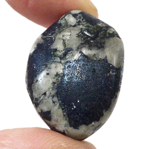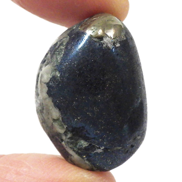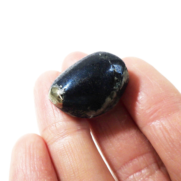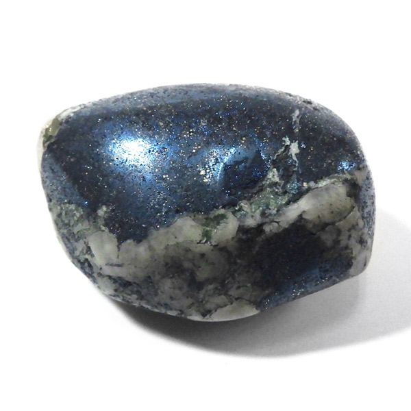 ペルー産のコベライト、タンブルです。コベライトは銅鉱床の上部にできる鉱物で、66%もの銅を含んでいます。パイライトから変化したものが多く、表面はコベライトでも、割ってみると中からパイライトが顔を覗かせることがあります。銅を含む鉱物は、マラカイトなど緑色をしたものが一番多いのですが、コベライトやアズライトのように藍色に発色するものもあります。青く輝く金属光沢がかっこよく、とても魅力的な鉱物です。