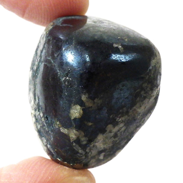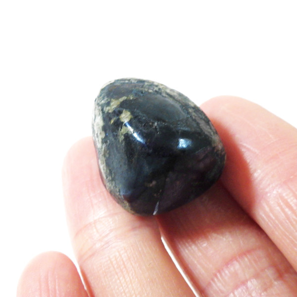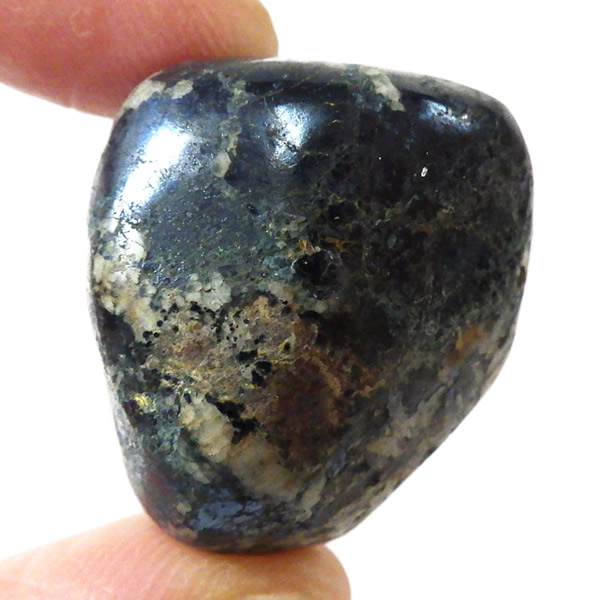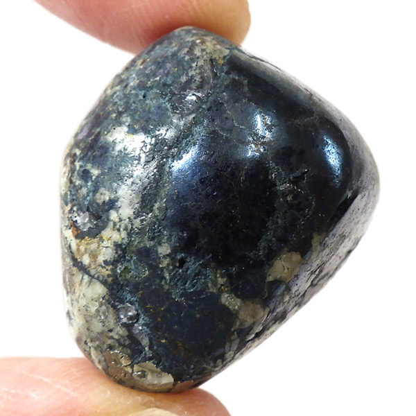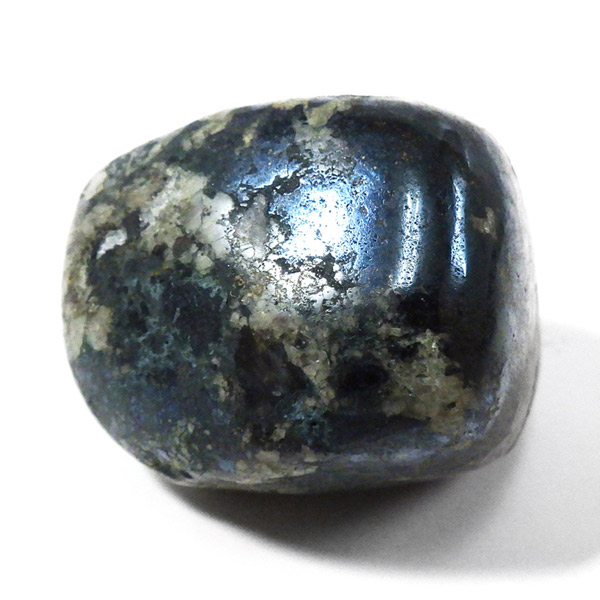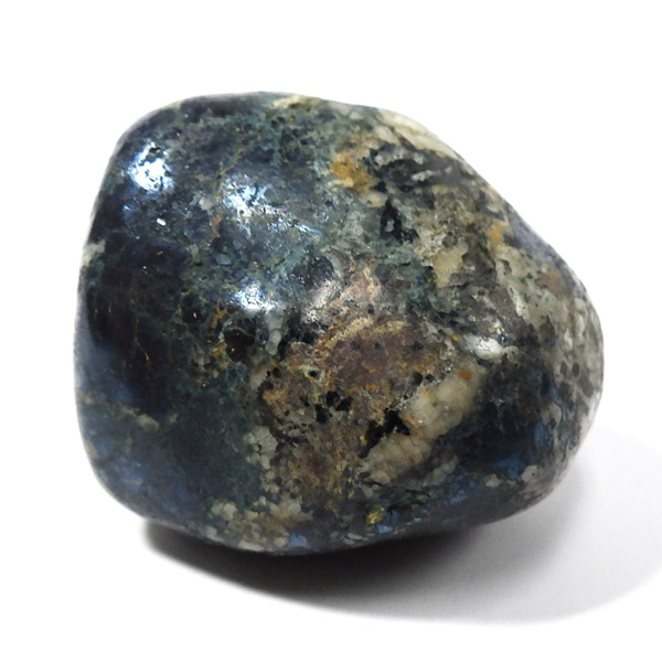 ペルー産のコベライト、タンブルです。コベライトは銅鉱床の上部にできる鉱物で、66%もの銅を含んでいます。パイライトから変化したものが多く、表面はコベライトでも、割ってみると中からパイライトが顔を覗かせることがあります。銅を含む鉱物は、マラカイトなど緑色をしたものが一番多いのですが、コベライトやアズライトのように藍色に発色するものもあります。青く輝く金属光沢がかっこよく、とても魅力的な鉱物です。