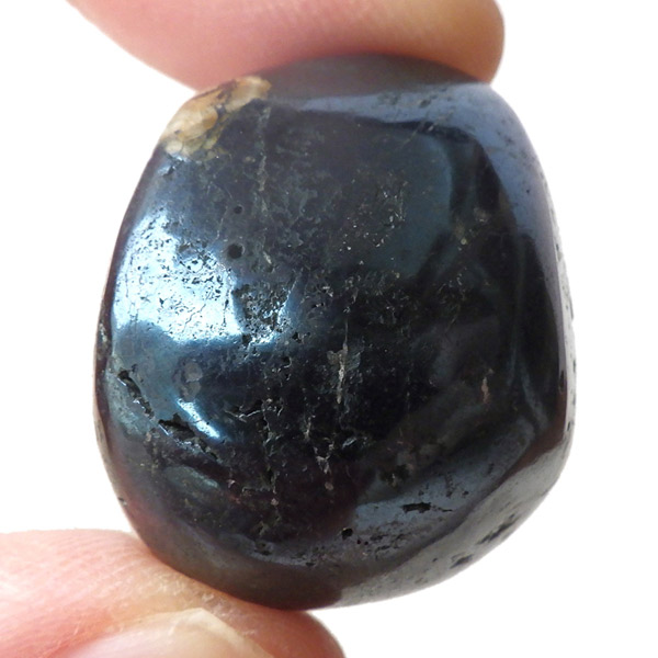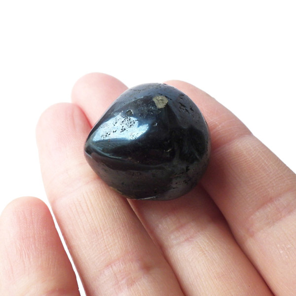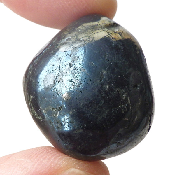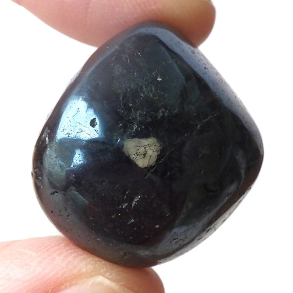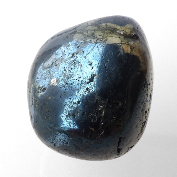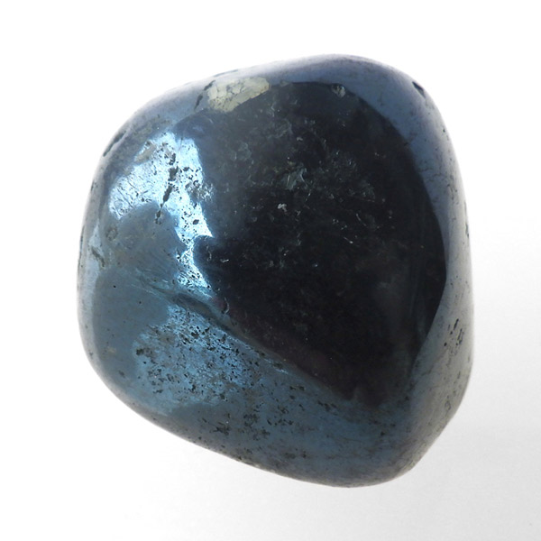 ペルー産のコベライト、タンブルです。コベライトは銅鉱床の上部にできる鉱物で、66%もの銅を含んでいます。パイライトから変化したものが多く、表面はコベライトでも、割ってみると中からパイライトが顔を覗かせることがあります。銅を含む鉱物は、マラカイトなど緑色をしたものが一番多いのですが、コベライトやアズライトのように藍色に発色するものもあります。青く輝く金属光沢がかっこよく、とても魅力的な鉱物です。