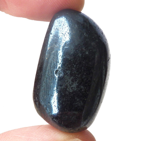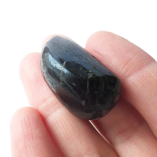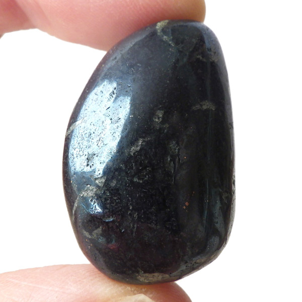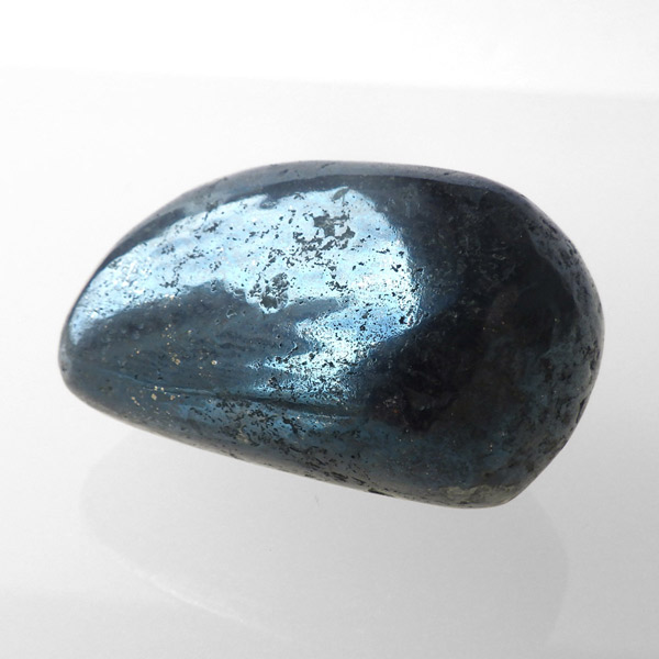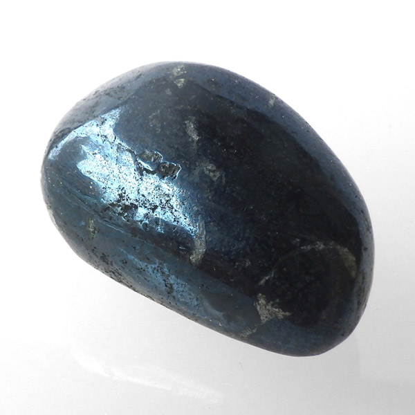 ペルー産のコベライト、タンブルです。コベライトは銅鉱床の上部にできる鉱物で、66%もの銅を含んでいます。パイライトから変化したものが多く、表面はコベライトでも、割ってみると中からパイライトが顔を覗かせることがあります。銅を含む鉱物は、マラカイトなど緑色をしたものが一番多いのですが、コベライトやアズライトのように藍色に発色するものもあります。青く輝く金属光沢がかっこよく、とても魅力的な鉱物です。