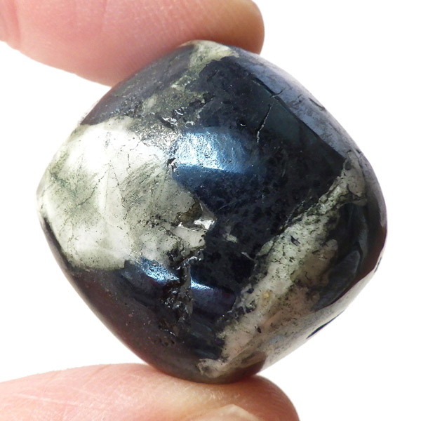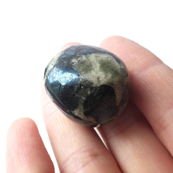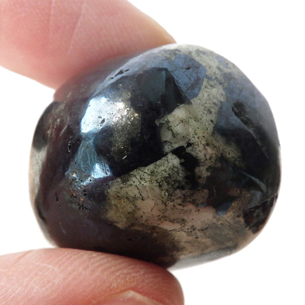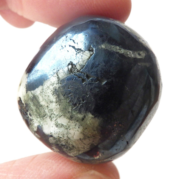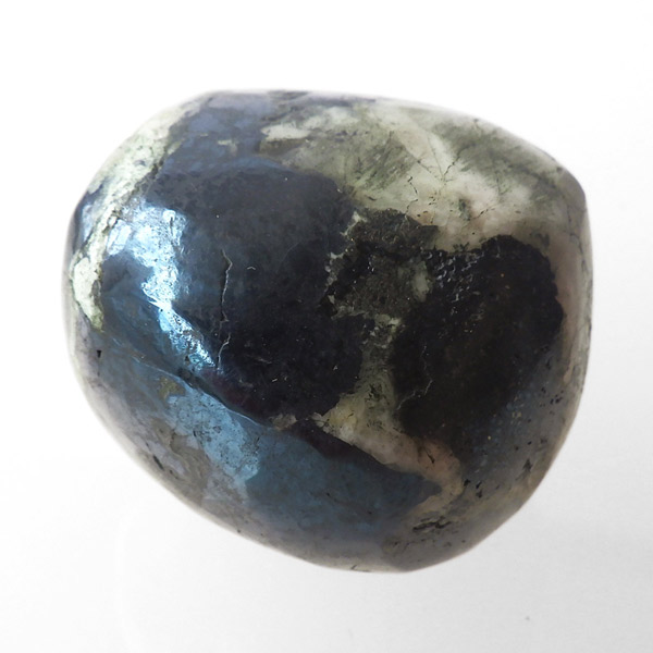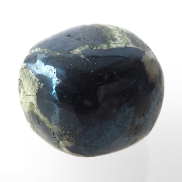 ペルー産のコベライト、タンブルです。コベライトは銅鉱床の上部にできる鉱物で、66%もの銅を含んでいます。パイライトから変化したものが多く、表面はコベライトでも、割ってみると中からパイライトが顔を覗かせることがあります。銅を含む鉱物は、マラカイトなど緑色をしたものが一番多いのですが、コベライトやアズライトのように藍色に発色するものもあります。青く輝く金属光沢がかっこよく、とても魅力的な鉱物です。