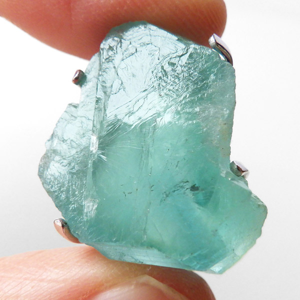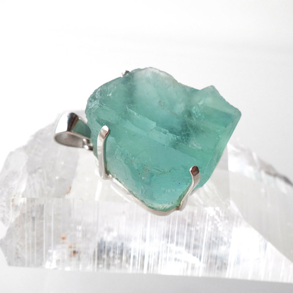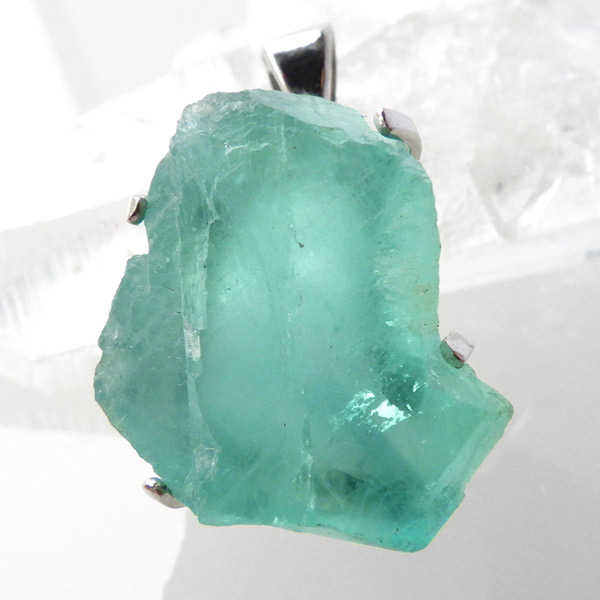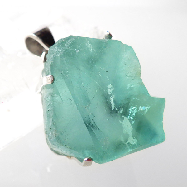 ドイツ・シュヴァルツヴァルト産のブルーグリーンフローライトペンダントトップです。当たる光の関係で、ブルーやグリーンに見える美しいフローライトの結晶です。このフローライトはドイツの「シュヴァルツヴァルト」で産出されたものです。「シュヴァルツヴァルト」とは、ドイツ語で「黒い森」を意味し、この森は、密集して生えるトウヒの木によって、暗く見える事によりその名が付きました。ここで産出されるフローライトはブルーグリーンの美しいものが多く、塊状に出土します。そんなフローライト原石をそのままペンダントトップに仕上げました。発色の良いフローライトで、光を通すと爽やかな色味がとってもきれいです。
