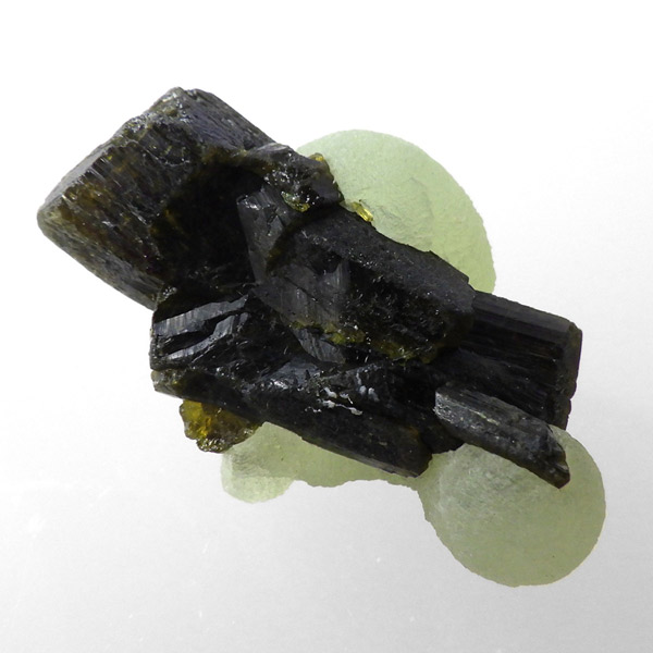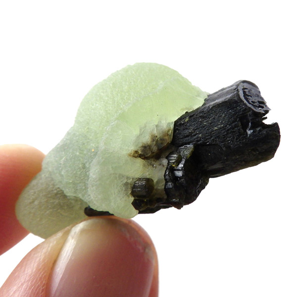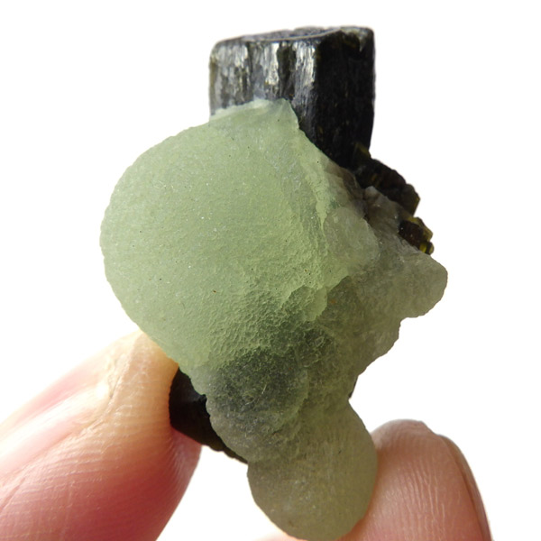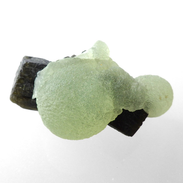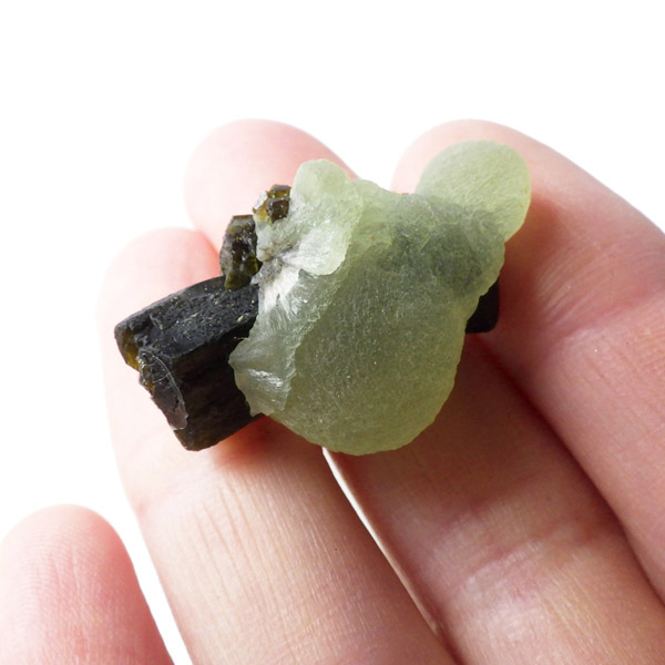 コロッとした形が可愛らしマリ共和国産のプレナイト with エピドート原石です。 ぶどうのように見えることから、和名でぶどう石(葡萄石)と呼ばれています。 優しい黄緑色の色彩で透明度が高いことが特徴です。 母岩にはプレナイトの内包物として良く見られる、深緑の針柱状の鉱物、エピドート(緑簾石)が共生しています。形も良くかわいらしいプレナイトです。