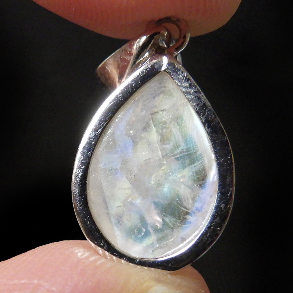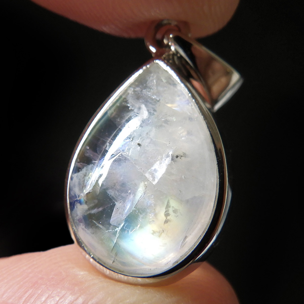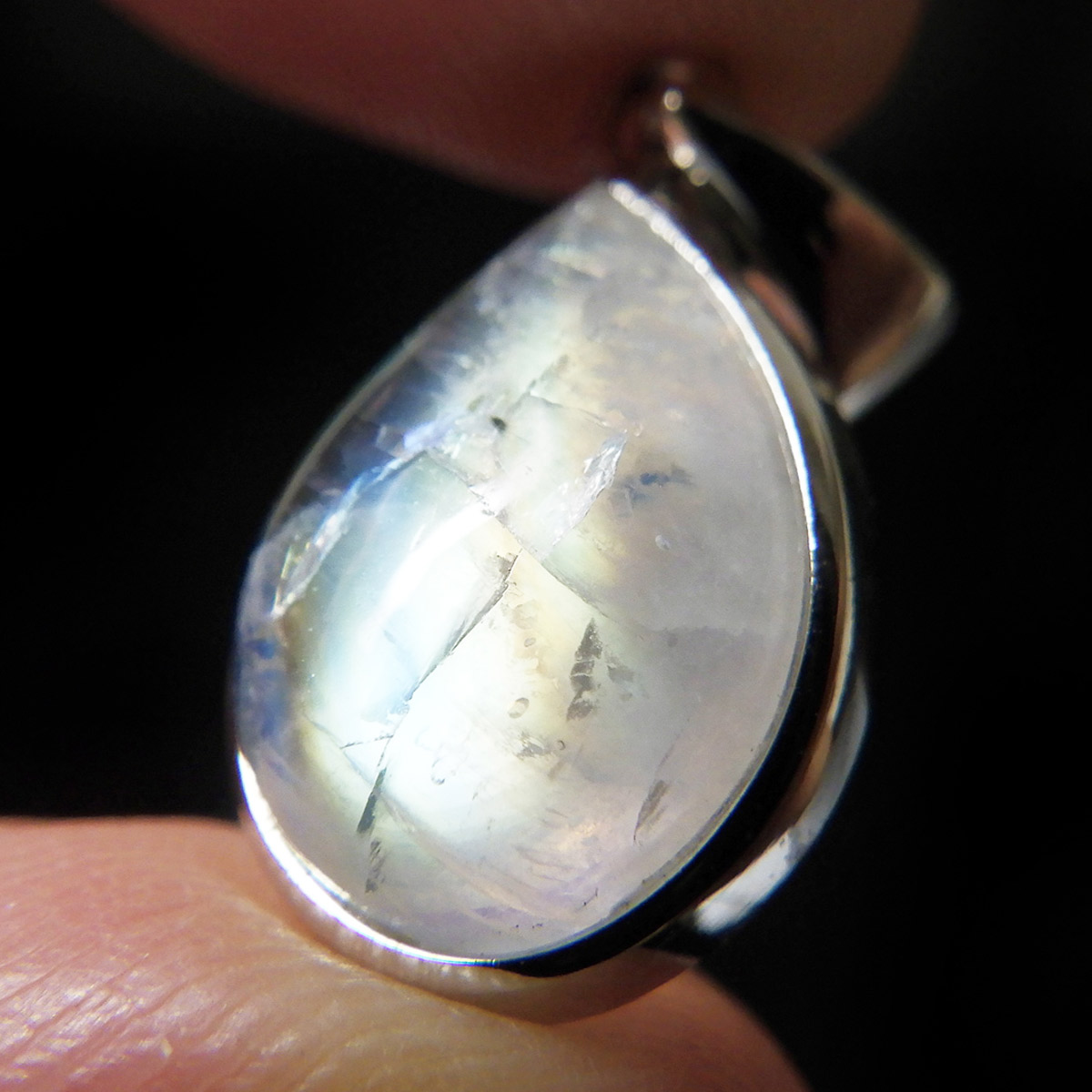 インド産レインボームーンストーンのペンダントトップです。レインボームーンストーン、又はホワイトラブラドライトとも呼ばれています。このレインボームーンストーンは、青白く神秘的で素晴らしいシラーを楽しんでいただけます。半透明で石自体が美しく、角度によってオレンジ系やグリーン系のシラーがはっきりと見られます。角度を変えたり、光源の方向によって、石の中でシラーが動き、様々な表情を見せてくれます。