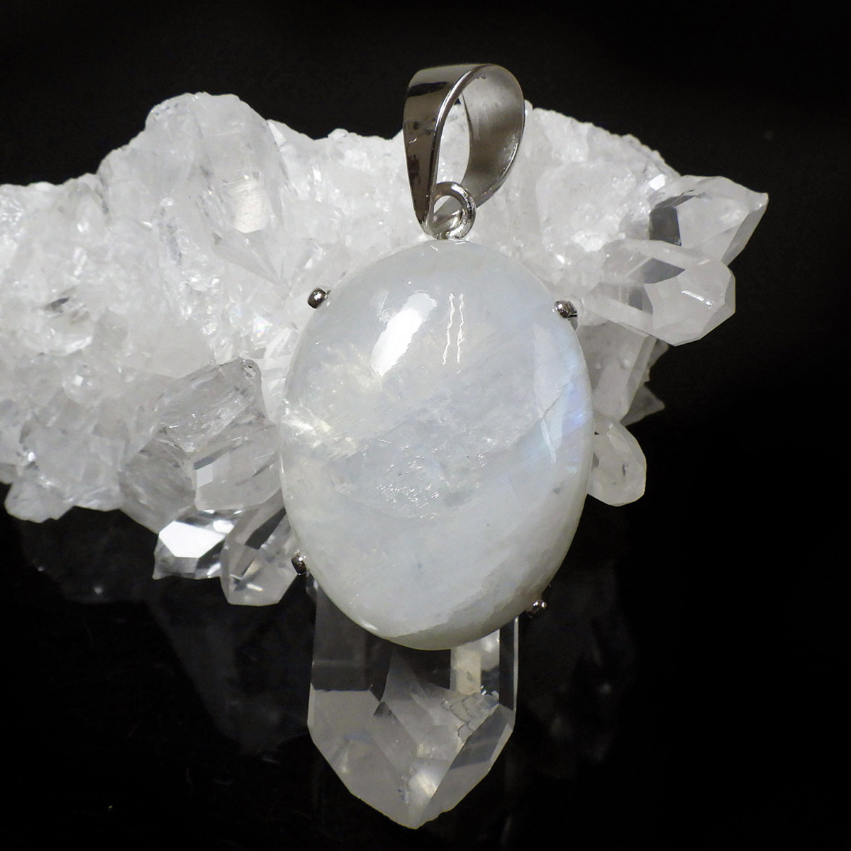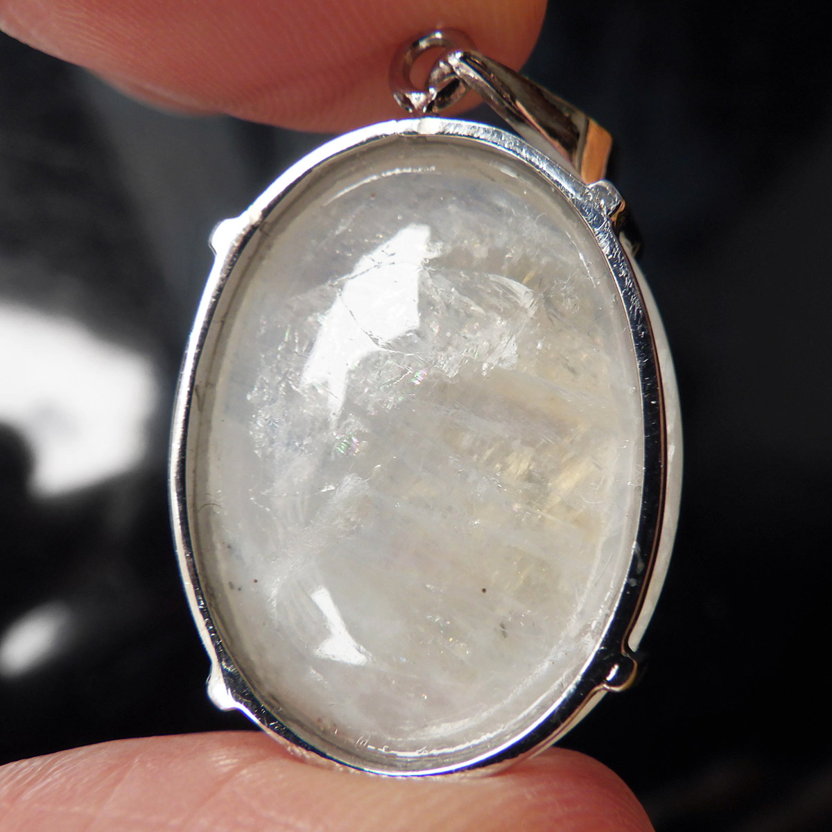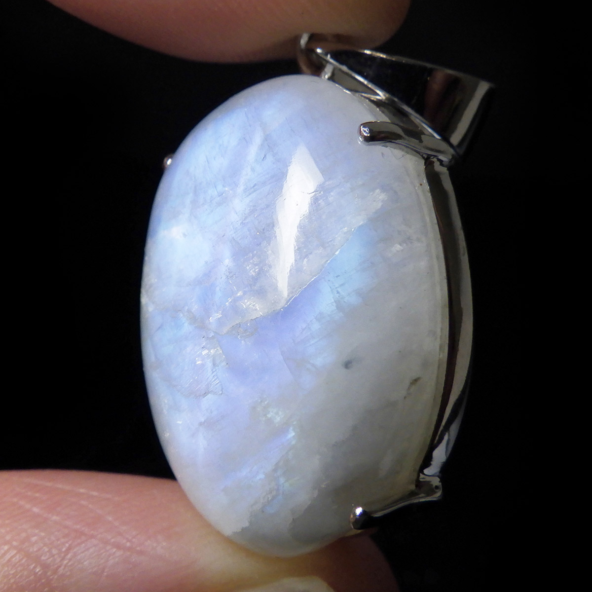 インド産ブルームーンストーンのペンダントトップです。このブルームーンストーンは、青白く神秘的で素晴らしいシラーを楽しんでいただけます。角度を変えたり、光源の方向によって、石の中でシラーが動き、様々な表情を見せてくれます。オーバル形で大き目に加工したため表面のシラーの表情がより楽しめると思います。