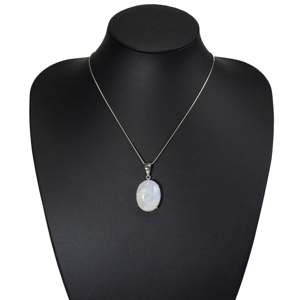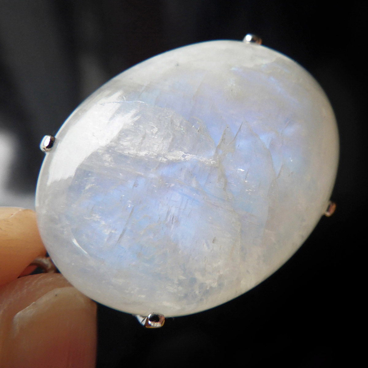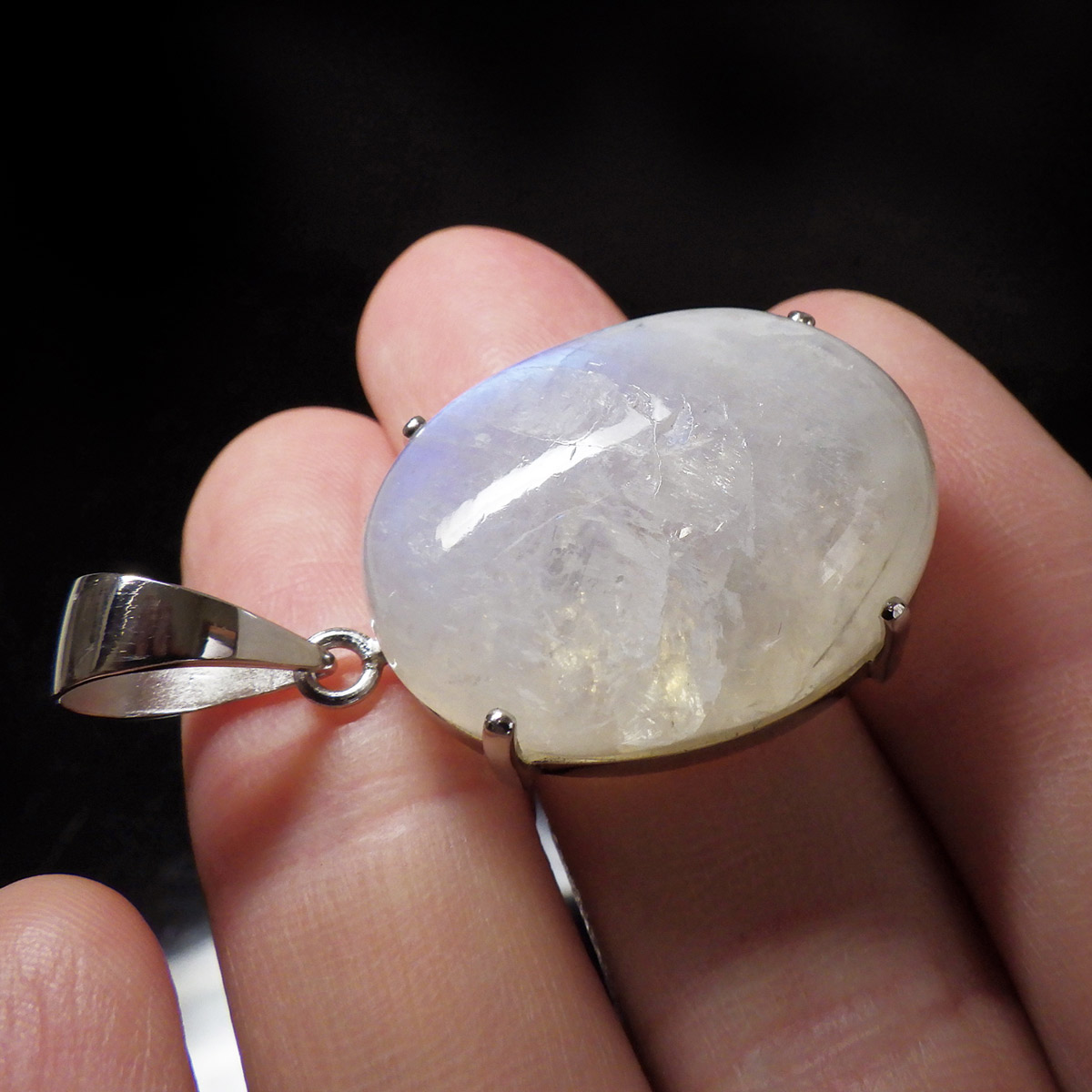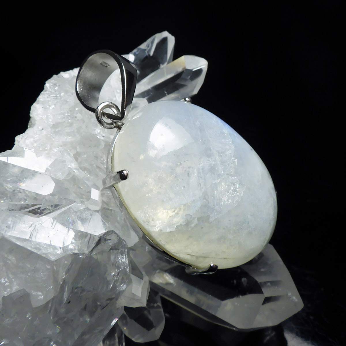 インド産ブルームーンストーンのペンダントトップです。このブルームーンストーンは、青白く神秘的で素晴らしいシラーを楽しんでいただけます。角度を変えたり、光源の方向によって、石の中でシラーが動き、様々な表情を見せてくれます。オーバル形で大き目に加工したため表面のシラーの表情がより楽しめると思います。