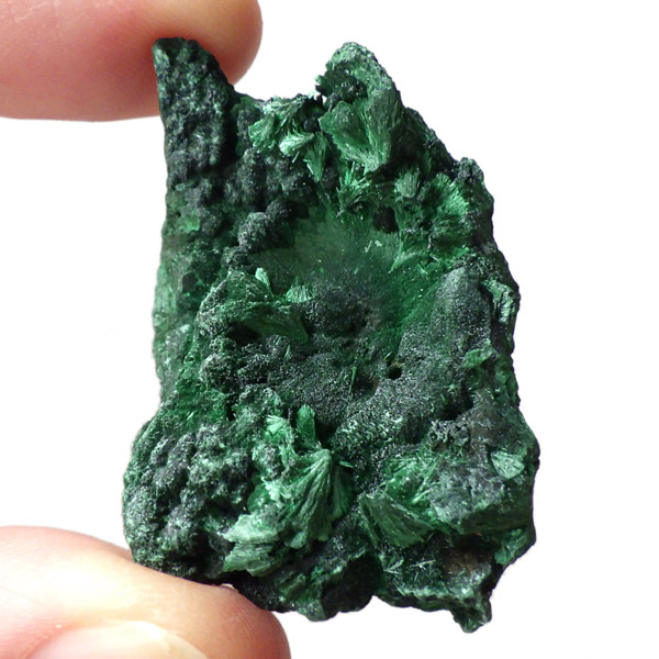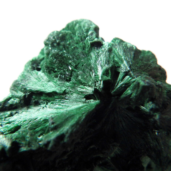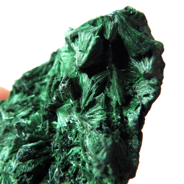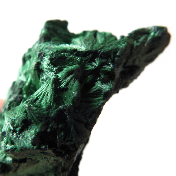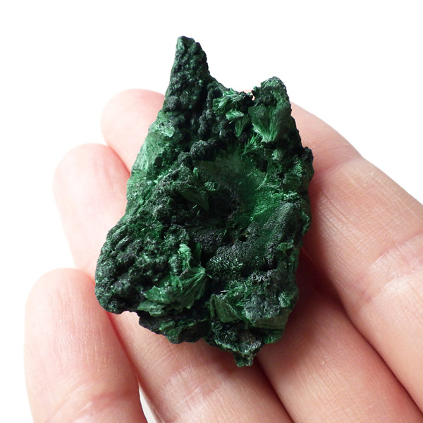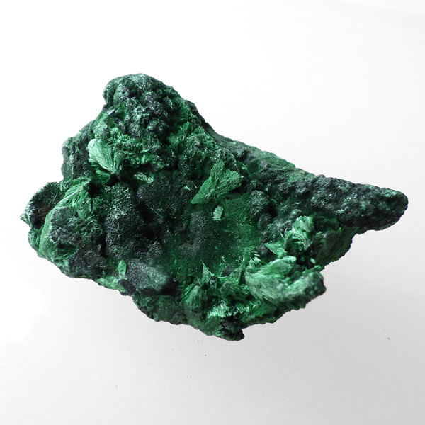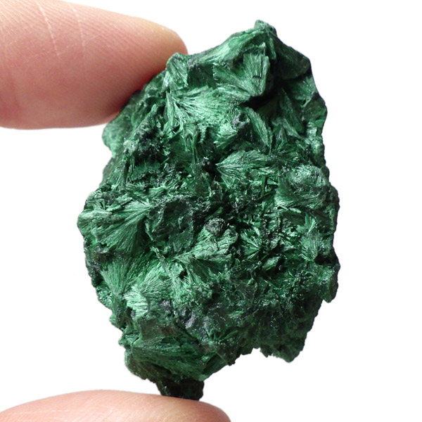 コンゴ産のマラカイト原石です。繊維状の結晶が集まった美しい一品で、ベルベットのような光沢があります。艶やかに光るきれいなグリーンで、一見脆そうに見えますが触ってみるとしっかりした結晶です。