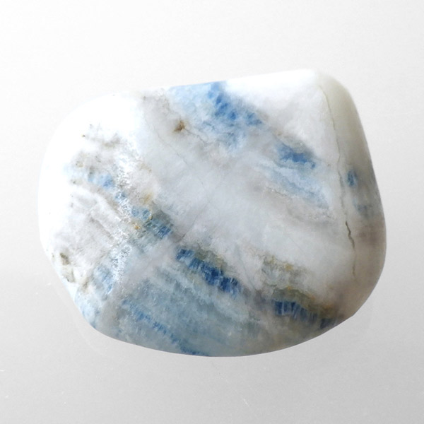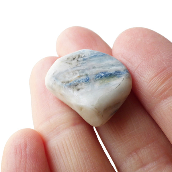 トルコ産ブルーシェーライト(シーライト)、タンブルです。この心静まるような美しいブルーの石はトルコの鉱山で唯一産出される混合石です。ブルーシェーライト(シーライト)と呼ばれていますが、厳密には主にドロマイトとカルサイトの混合物だそうです。クリーム色、金色または黄色の濃い部分はシェーライトで、青い部分はブルードロマイトです。青い縞模様(レース)が入ることから、ラピスレースオニキスという可愛らしいニックネームでも流通しております。欧米では少しづつ認知が進んでおりますが、日本ではまだまだ稀少なレアストーンです。