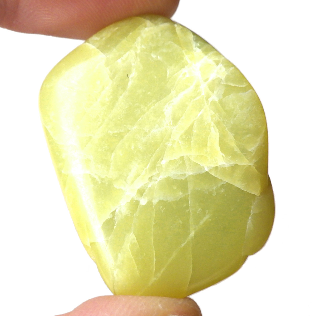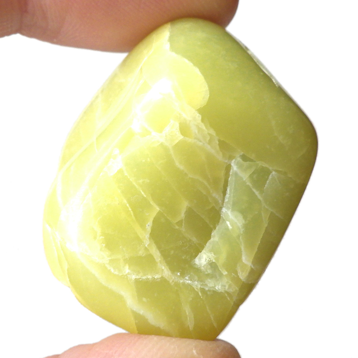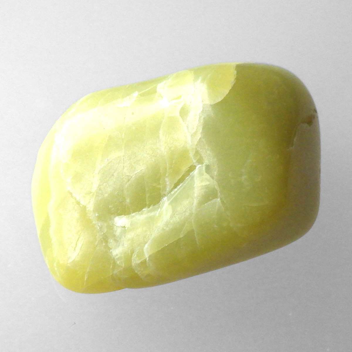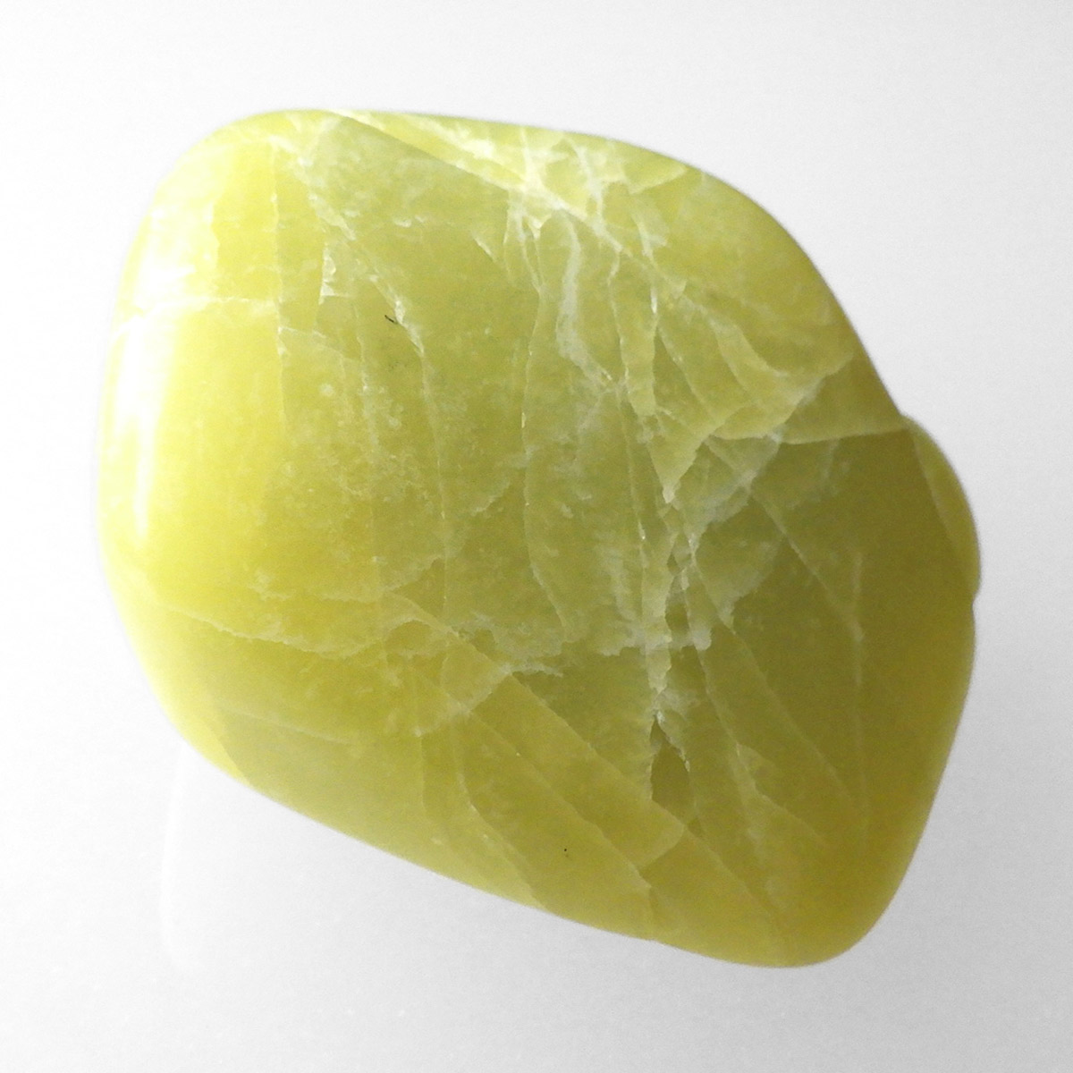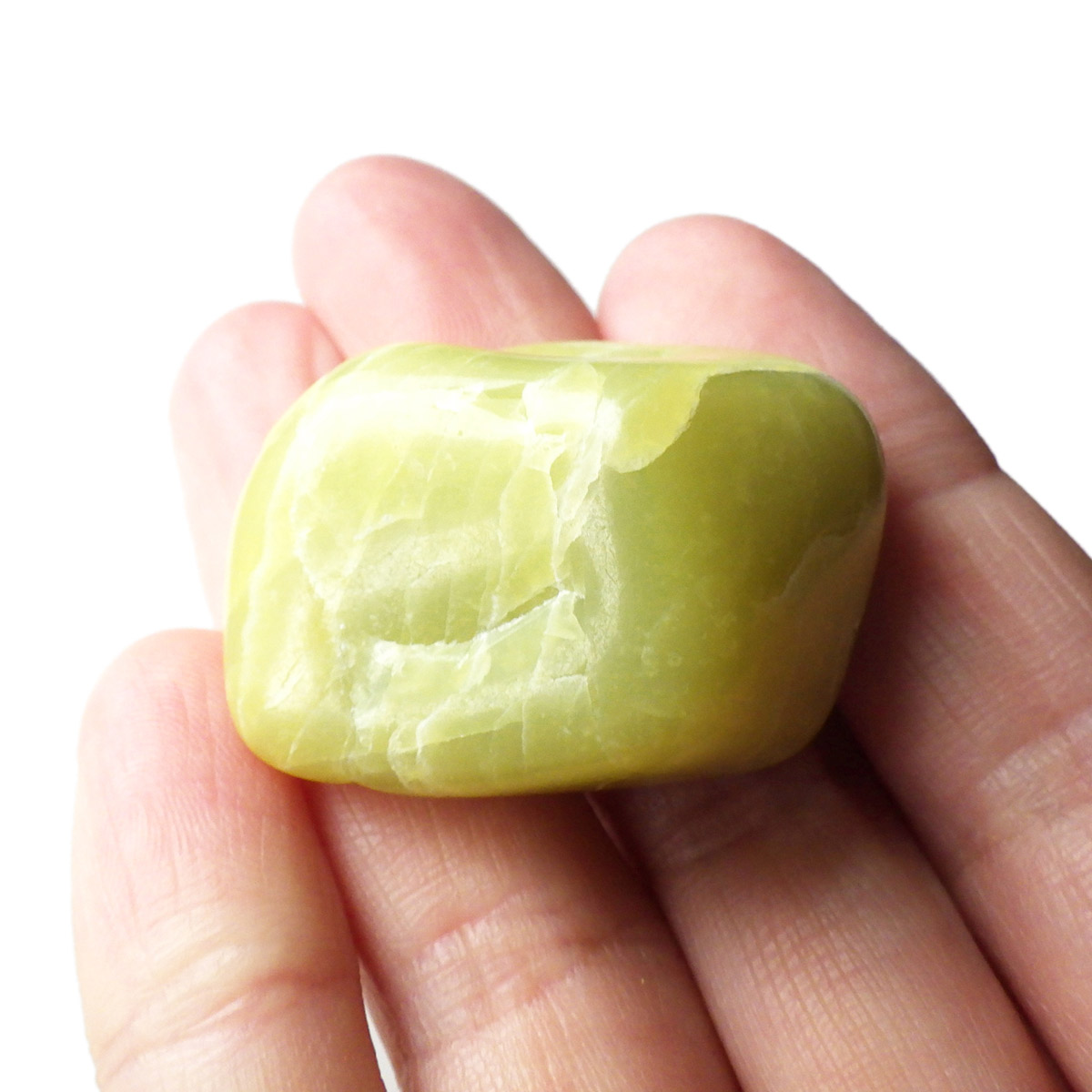 アメリカ・ワシントン州産のワシントンサーペンティン(ヒーラーライト)、タンブルです。 ワシントンサーペンティン(ヒーラーライト)は、明るいライムグリーン色をしており、やわらかな感触があります。 パッと見た感じは黄色の印象が強いと思いますが、良く見てみると黄色ではなくもっと複雑で独特の色合いをしていることが分かります。 アメリカの北西部で新しく発見されたケイ酸マグネシウムで、マグネサイト鉱脈から、マグネサイトと一緒に発掘されます。