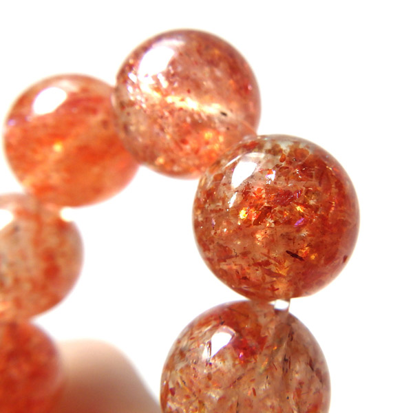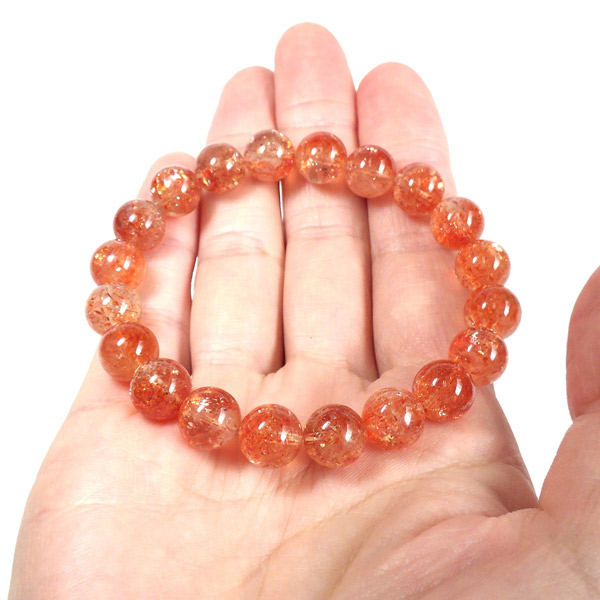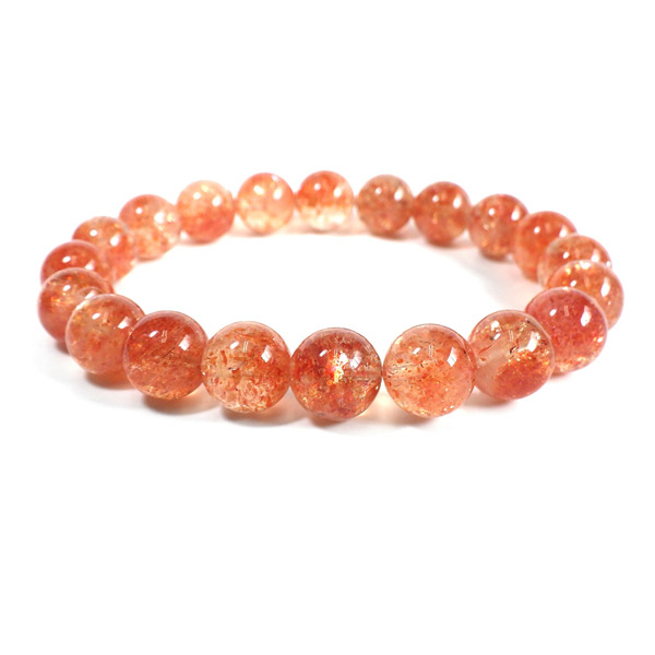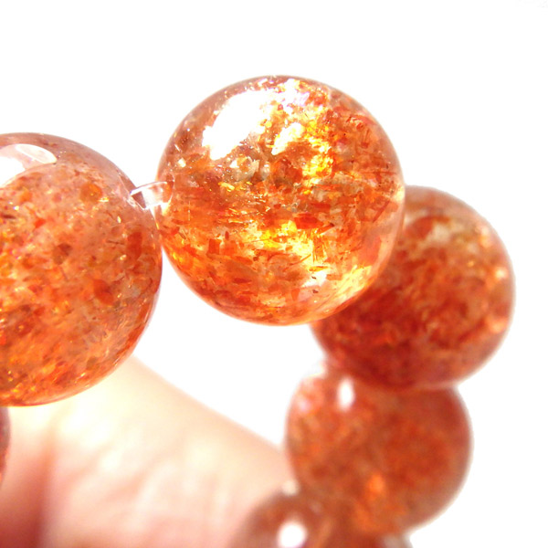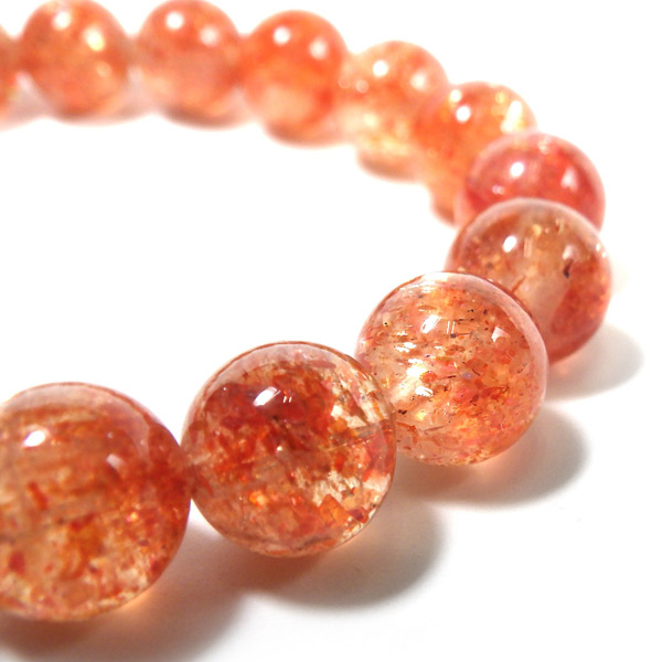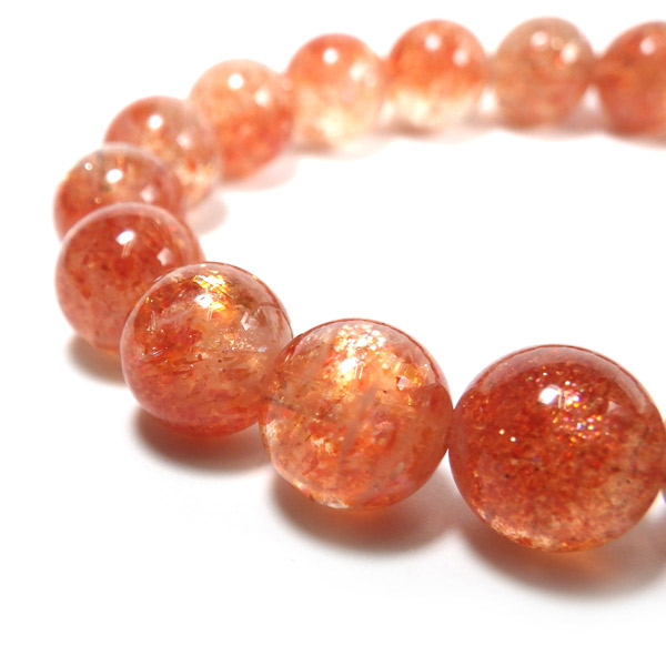 タンザニア産サンストーンを使用したブレスレットです。灼熱の太陽を彷彿とする、オレンジ色のキラキラした輝きが特徴です。ヘマタイトのオレンジ色と、マイカの織りなすキラキラがアクティブな心を刺激してくれます。透明度が高く光をよく通すので内包物の鮮やかさが増しており、涼しげな印象です。 サンストーンという名前は鉱物的な性質から名づけられたものではなく、ムーンストーンの静かな光と対照的に思えるキラキラした光を持つことから名づけられた、宝石としての名称です。