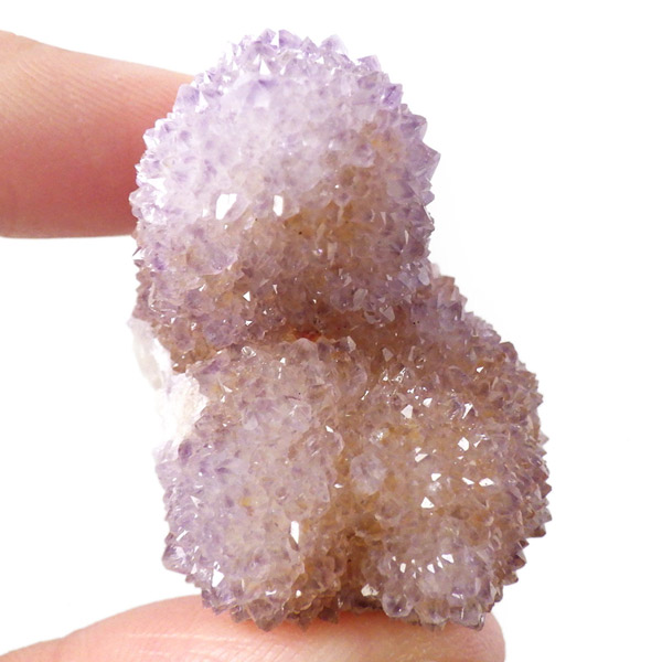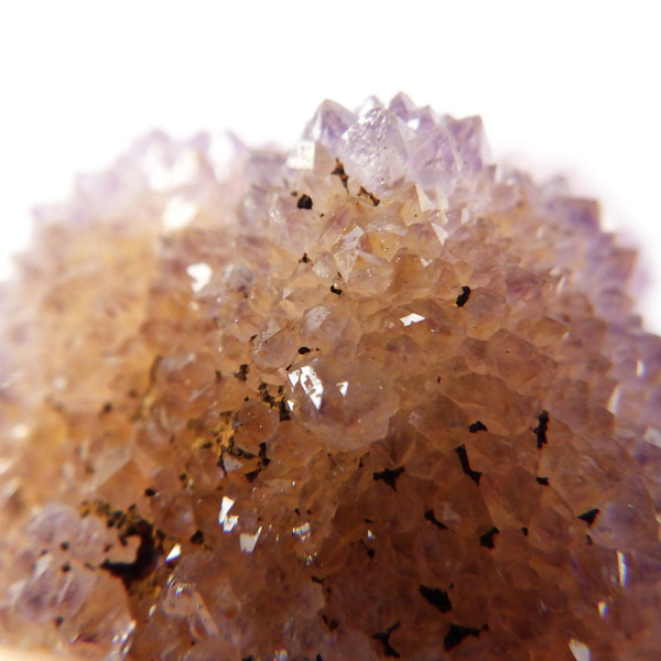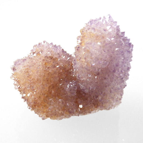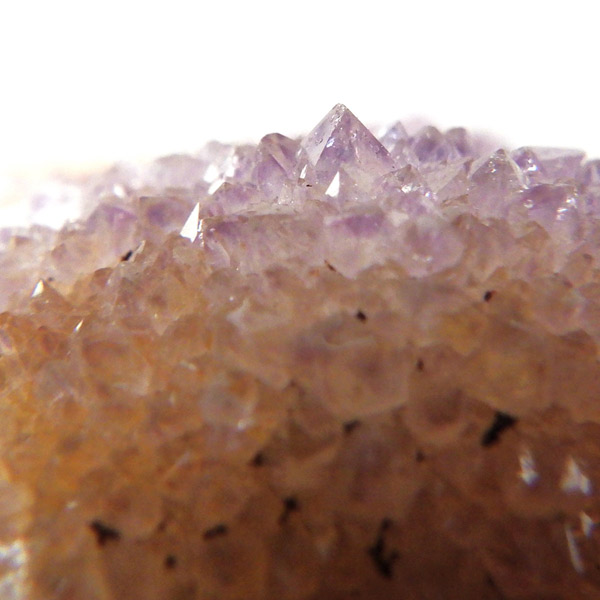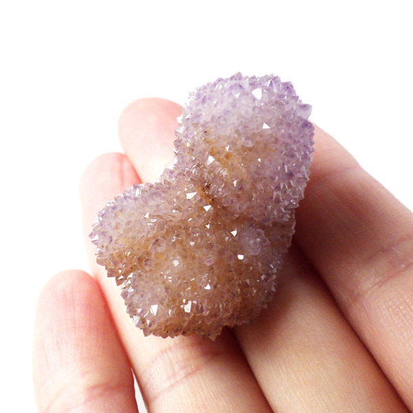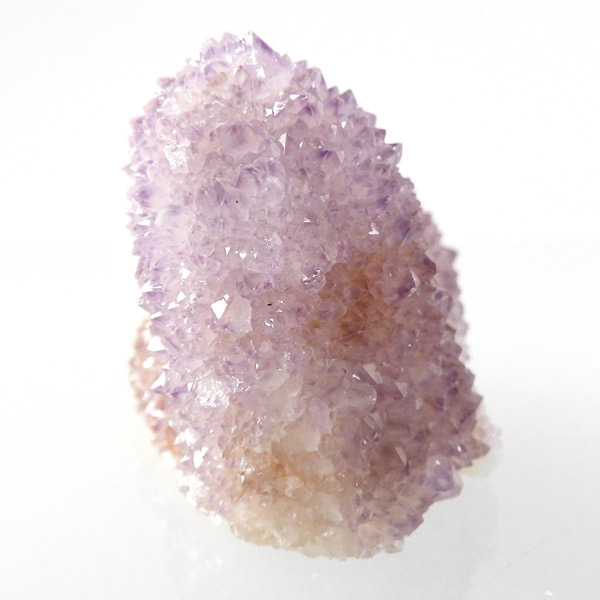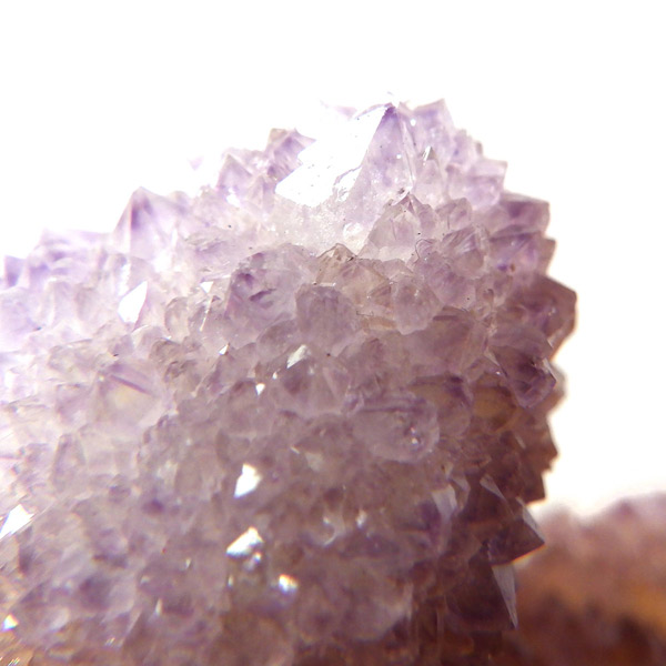 南アフリカ産、カクタスアメジスト原石です。カクタスアメジストは、細かな結晶に包まれるように、先端にポイントが伸びている特徴的なアメジストです。カクタスとは「サボテン」という意味で、見た目がサボテンに似ていることからこの名前がつけられ、サボテン水晶とも言われています。また、古来から精霊の宿る聖なる水晶とも崇められていて、スピリットクォーツとも言われています。細かな淡い結晶で形成されており、光を当てるとキラキラと神秘的な輝きを放ちます。表面の一部が黄色いリモナイト(褐鉄鉱)で覆われており、パープルとイエローのハーモニーが面白いです。