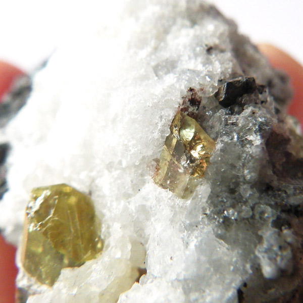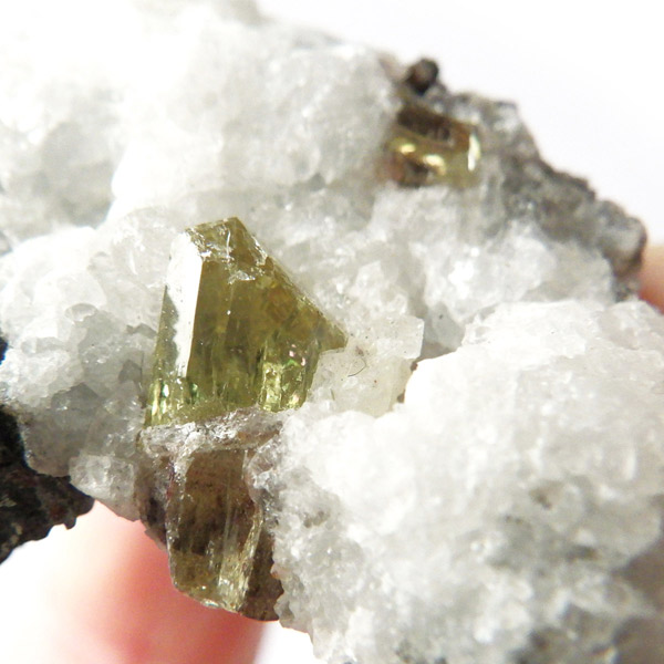 非常に透明度の高い、イエローグリーンの六角柱や六角板がキラキラと、大変美しく魅了されます。