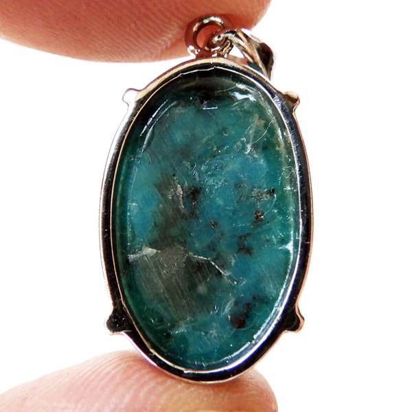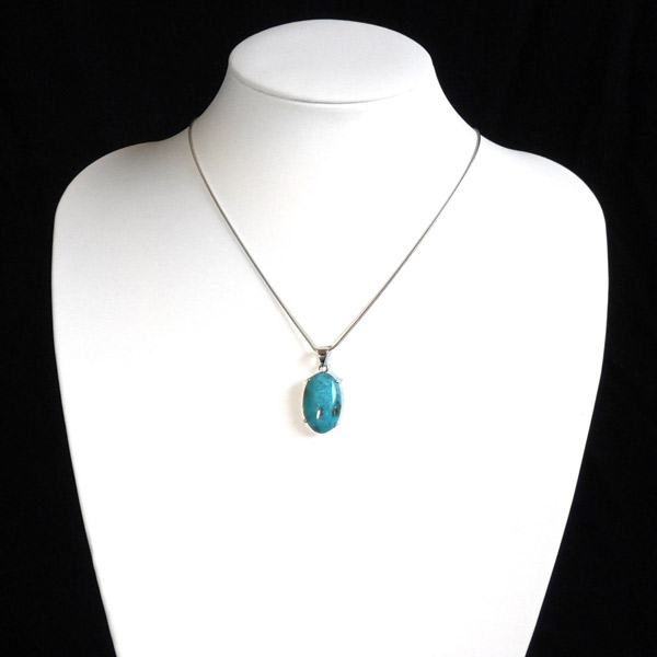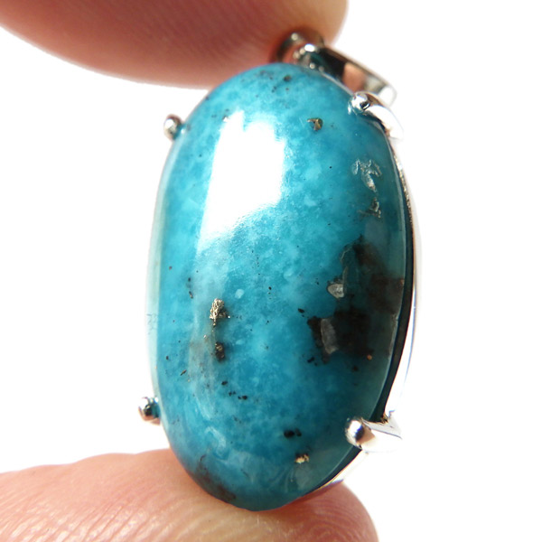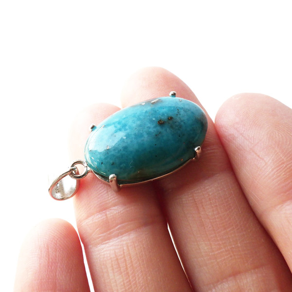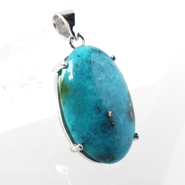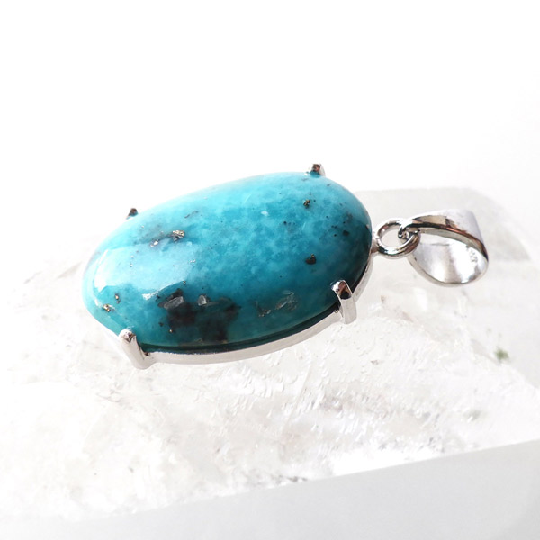 ターコイズの産出で有名なイラン産、ターコイズを使用したペンダントトップです。美しいブルーグリーンの明るめのターコイズカラーと黄鉄鉱もしくは白鉄鉱と思われる金属光沢がアクセントになったペンダントトップで、天然石特有の自然が創り出した芸術です。イラン産のターコイズは色調が均一でブルーよりの鮮やかな色が特徴的。贅沢に大き目のターコイズを使用しており、ペンダントトップとして存在感は抜群。ターコイズは魔除けの意味合いがあり、アクセサリーとしてとても人気が高いアイテムです。