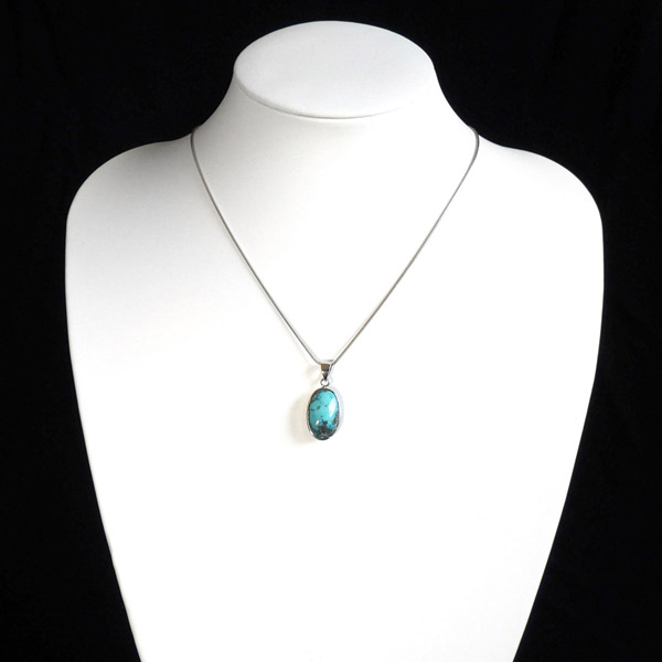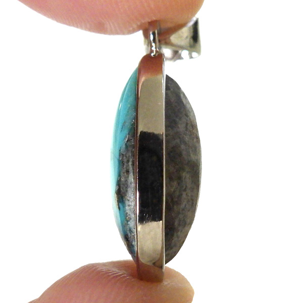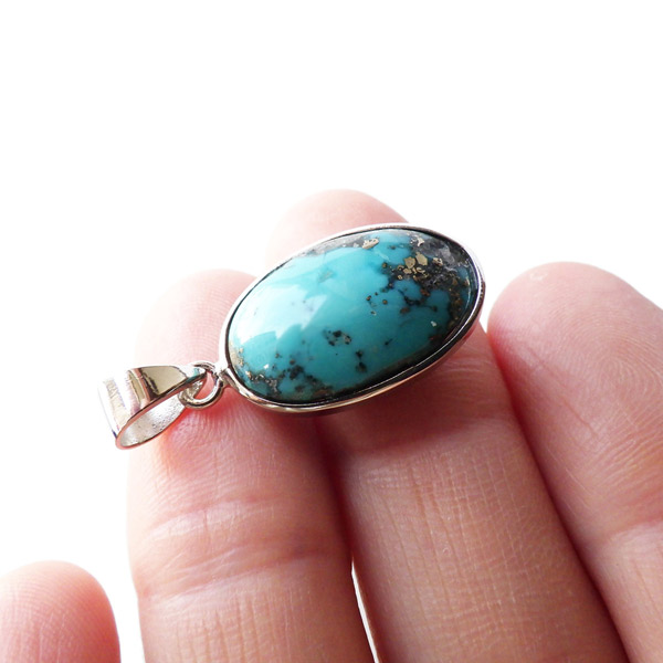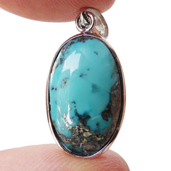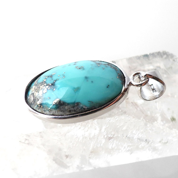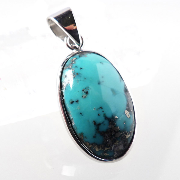 ターコイズの産出で有名なイラン産、ターコイズを使用したペンダントトップです。美しい明るめのターコイズカラーと黄鉄鉱もしくは白鉄鉱と思われる金属光沢が目を引くターコイズのペンダントトップで、天然石特有の自然が創り出した芸術です。イラン産のターコイズは色調が均一でブルーよりの鮮やかな色が特徴的。両面をぷっくりと加工しており、立体感あるペンダントトップです。ターコイズは魔除けの意味合いがあり、アクセサリーとしてとても人気が高いアイテムです。