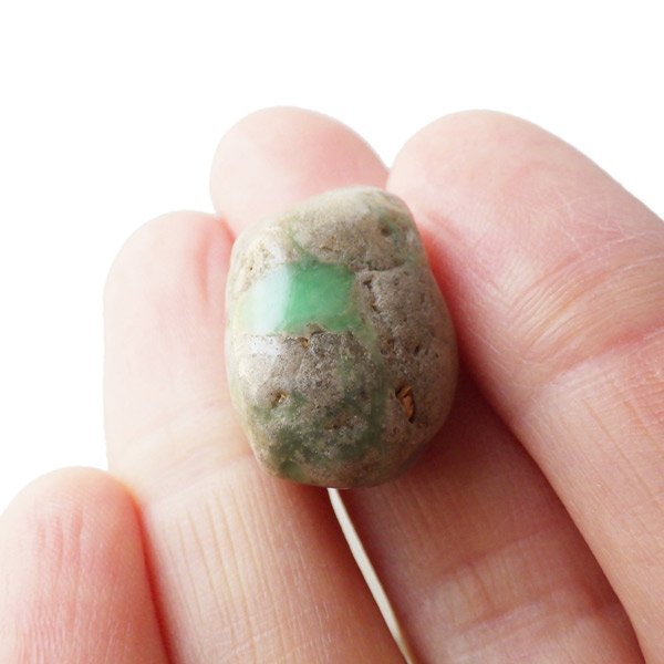 アメリカ・ユタ州産のバリサイトのタンブルです。バリサイトは、グリーンを基調に天然の模様が見られる石で、色合いも優しいパステルグリーンから、色鮮やかなグリーンまで様々です。アメリカのユタ山脈から採掘される事から「ユタライト・ユタターコイズ・ユタトルコ」と呼ぶこともあるようです。緑色に黒や白のまだら模様が入る事が多く、品質の良いものになるとクリソプレーズや翡翠のような美しい緑色をしております。