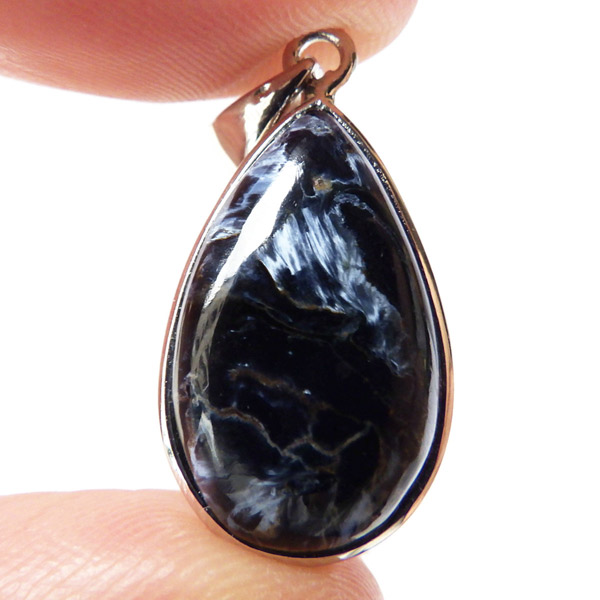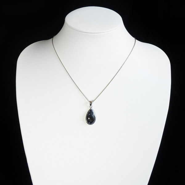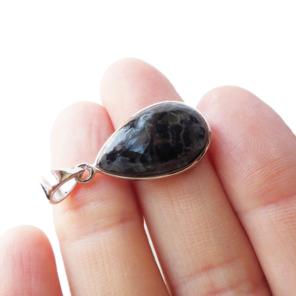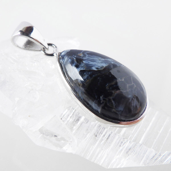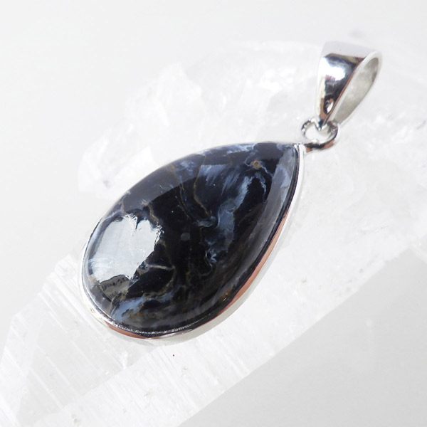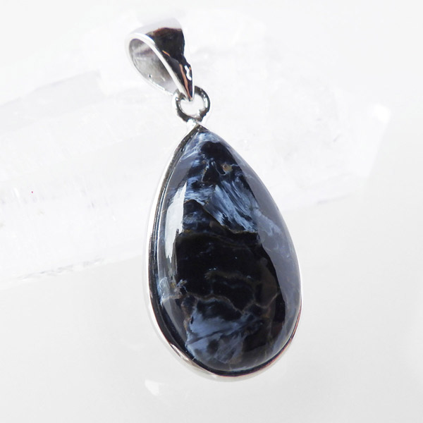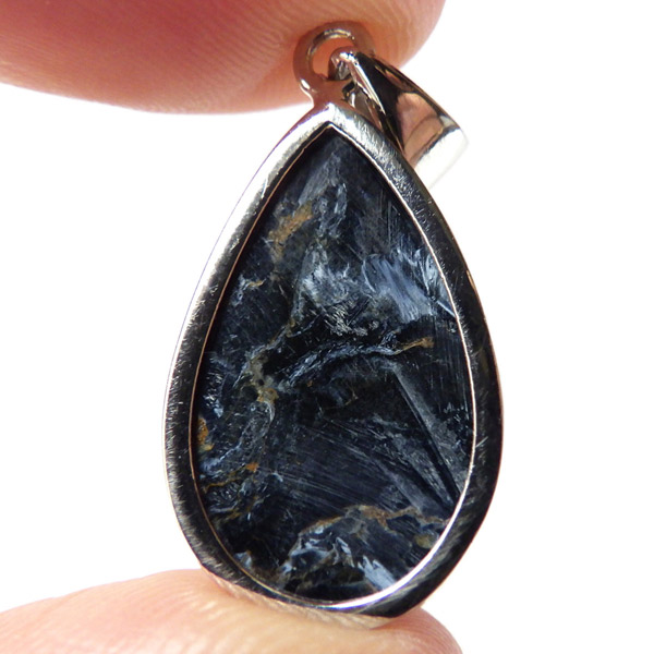 ナミビア産ブルーピーターサイトのペンダントトップです。タイガーアイの成分を持つ鉱物が、地殻変動によって粉砕され、膨大な年月を掛けて石英により自然に接合されて出来た鉱物です。そのため、タイガーアイのように繊維が直線状に形成されず、油絵のような独特のうねりのある模様になります。名称は「シド・ピーターズ」によってナミビアで初めて発見されたため、発見者にちなんで「ピーターサイト」命名されました。独特の色模様が、嵐のようにも見えることから、別名「テンペストストーン(嵐の石)」とも呼ばれることが有ります。鉱物学的名正式名称はクロシドライトアゲートとなります。ピーターサイトのカラーは、レッドやイエローもありますが、ナミビア産のものはホークスアイに近いブルーの色合いをしており、この魅惑の美しさから、人気が高く大変希少となります。表面の罅の様に見える箇所もうねりの模様で、丁寧な研磨により表面はツルツル滑らかに仕上げております。