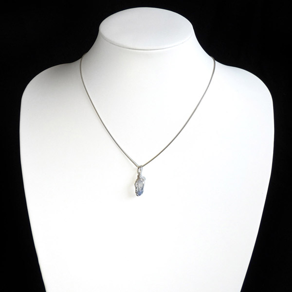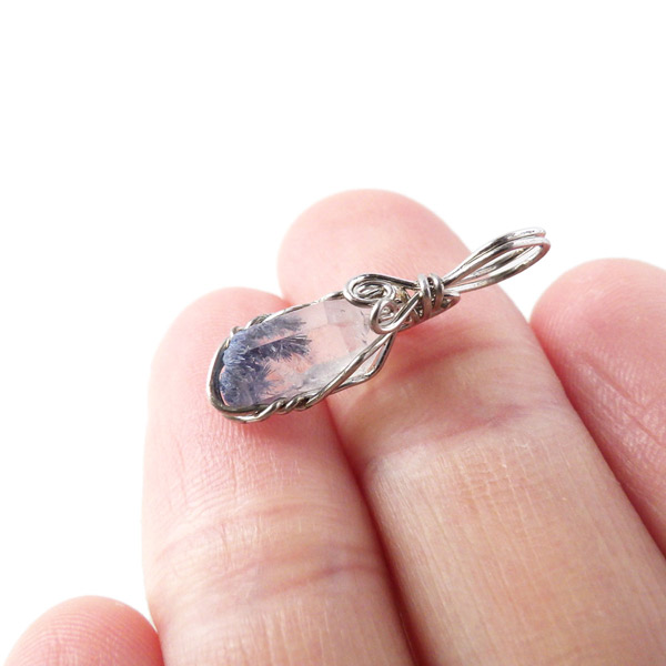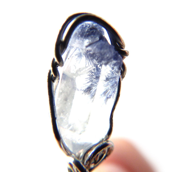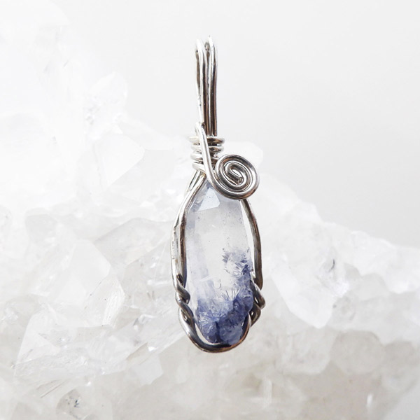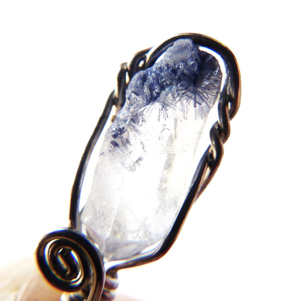 ブラジル産のデュモルチェライトインクォーツ、ワイヤーアートペンダントトップです。デュモルチェライトは、一般的に塊状で産出され、その見た目から ラピスラズリやソーダライト等と混同されていました。しかし、フランスのE.デュモルティエが成分を確認したところ、別の鉱物と言うことが判り、彼の名前に因んでデュモルチェライトと命名されました。この鮮やかな青色は内包する鉄とチタンによる発色で、中でも花が咲いたような美しい結晶は稀少性が高く非常に人気があります。水晶に包まれたデュモルチェライトの結晶はとても繊細で美しいです。小さな水晶ポイント内に内包されたデュモルチェライトをそのままの姿でワイヤーアート加工にてペンダントトップに仕上げております。