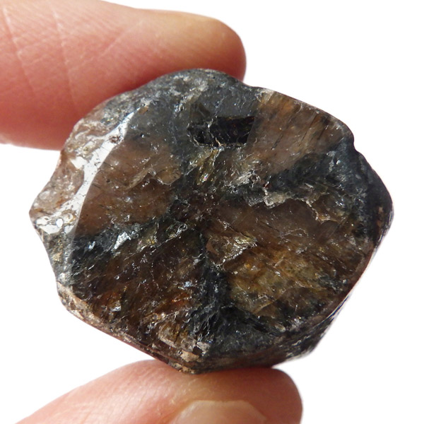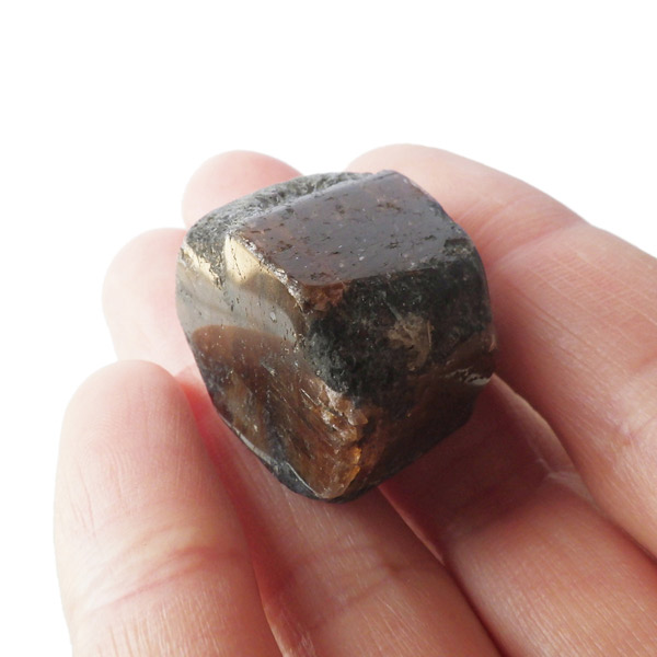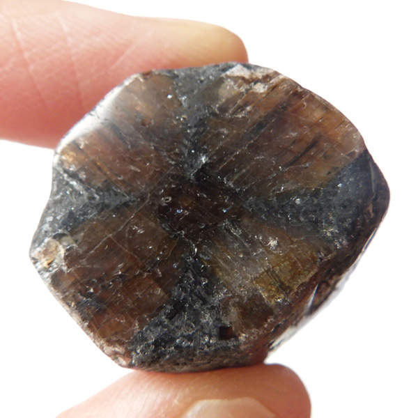ブラジル産、キャストライト磨き原石です。キャストライトは濃いブラウンに黒の十字模様が大変魅力的な石です。キャストライトの名前は、輪切りにすると黒い十字の模様が現れることから、ギリシャ語で「対角線的な配列」という意味の「Chiastos」に由来しています。キャストライトは、黒鉛(グラファイト)などの黒色含有物を対称的に含んだ紅柱石です。クロスストーンとも呼ばれ、粘板岩と花こう岩の接触部に産出します。黒の十字が目を引く一方、茶色のサイド面の結晶がキラキラと美しく見えるのも魅力的です。