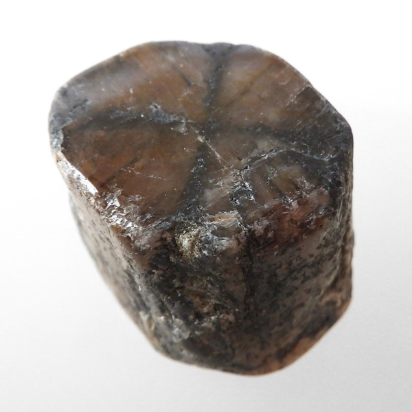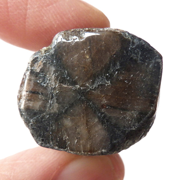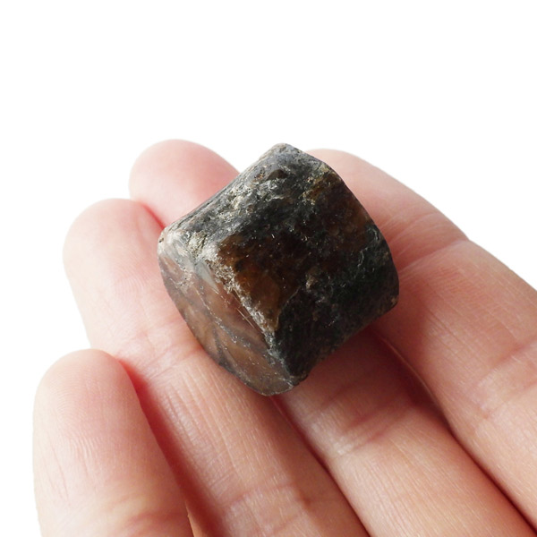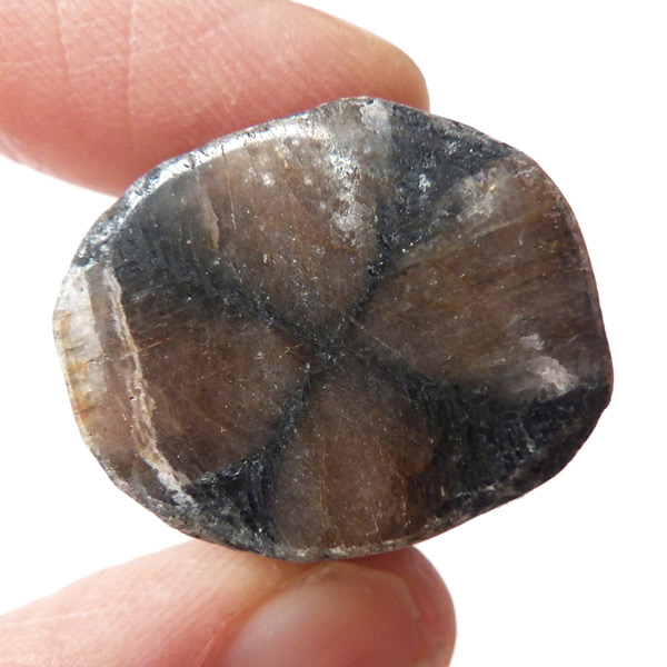 ブラジル産、キャストライト磨き原石です。キャストライトは濃いブラウンに黒の十字模様が大変魅力的な石です。キャストライトの名前は、輪切りにすると黒い十字の模様が現れることから、ギリシャ語で「対角線的な配列」という意味の「Chiastos」に由来しています。キャストライトは、黒鉛(グラファイト)などの黒色含有物を対称的に含んだ紅柱石です。クロスストーンとも呼ばれ、粘板岩と花こう岩の接触部に産出します。黒の十字が目を引く一方、茶色のサイド面の結晶がキラキラと美しく見えるのも魅力的です。